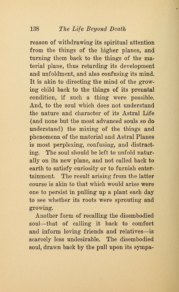 reason of withdrawing its spiritual attention from the things of the higher planes, and turning them back to the things of the material plane, thus retarding its development and unfoldment, and also confusing its mind. It is akin to directing the mind of the growing child back to the things of its prenatal condition, if such a thing were possible. And, to the soul which does not understand the nature and character of its Astral Life (and none but the most advanced souls so do understand) the mixing of the things and phenomena of the material and Astral Planes is most perplexing, confusing, and distracting. The soul should be left to unfold naturally on its new plane, and not called back to earth to satisfy curiosity or to furnish entertainment. The result arising from the latter course is akin to that which would arise were one to persist in pulling up a plant each day to see whether its roots were sprouting and growing.