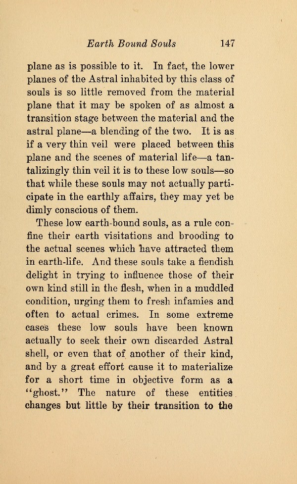 plane as is possible to it. In fact, the lower planes of the Astral inhabited by this class of souls is so little removed from the material plane that it may be spoken of as almost a transition stage between the material and the astral plane --- a blending of the two. It is as if a very thin veil were placed between this plane and the scenes of material life --- a tantalizingly thin veil it is to these low souls --- so that while these souls may not actually participate in the earthly affairs, they may yet be dimly conscious of them.
