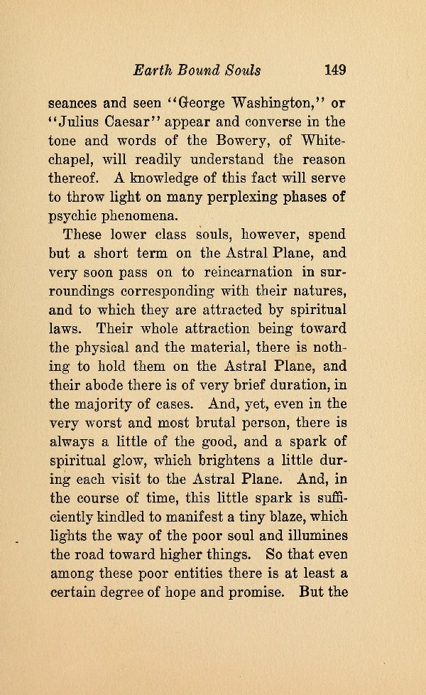 These lower class souls, however, spend but a short term on the Astral Plane, and very soon pass on to reincarnation in surroundings corresponding with their natures, and to which they are attracted by spiritual laws. Their whole attraction being toward the physical and the material, there is nothing to hold them on the Astral Plane, and their abode there is of very brief duration, in the majority of cases. And, yet, even in the very worst and most brutal person, there is always a little of the good, and a spark of spiritual glow, which brightens a little during each visit to the Astral Plane. And, in the course of time, this little spark is sufficiently kindled to manifest a tiny blaze, which Heats the way of the poor soul and illumines the road toward higher things. So that even among these poor entities there is at least a certain degree of hope and promise. But the