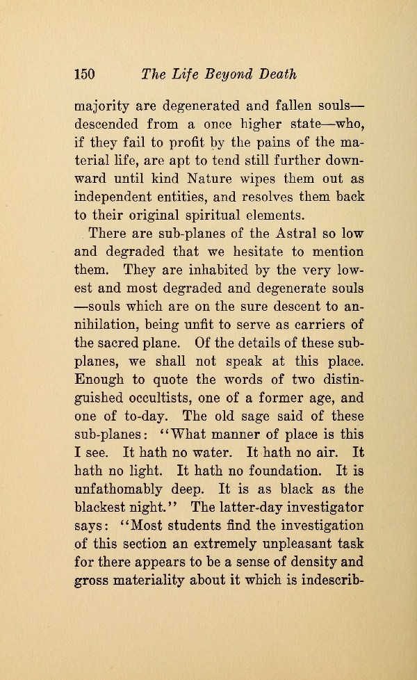 There are sub-planes of the Astral so low and degraded that we hesitate to mention them. They are inhabited by the very lowest and most degraded and degenerate souls --- souls which are on the sure descent to annihilation, being unfit to serve as carriers of the sacred plane. Of the details of these subplanes, we shall not speak at this place. Enough to quote the words of two distinguished occultists, one of a former age, and one of to-day. The old sage said of these sub-planes: "What manner of place is this I see. It hath no water. It hath no air. It bath no light. It hath no foundation. It is unfathomably deep. It is as black as the blackest night." The latter-day investigator says: "Most students find the investigation of this section an extremely unpleasant task for there appears to be a sense of density and gross materiality about it which is indescribably