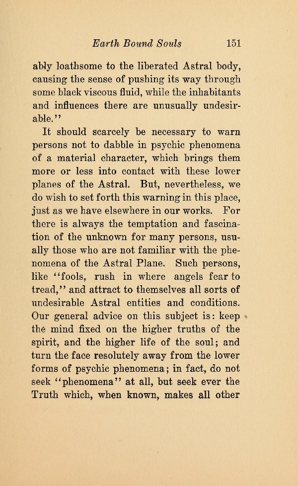 It should scarcely be necessary to warn persons not to dabble in psychic phenomena of a material character, which brings them more or less into contact with these lower planes of the Astral. But, nevertheless, we do wish to set forth this warning in this place, just as we have elsewhere in our works. For there is always the temptation and fascination of the unknown for many persons, usually those who are not familiar with the phenomena of the Astral Plane. Such persons, like "fools, rush in where angels fear to tread," and attract to themselves all sorts of undesirable Astral entities and conditions. Our general advice on this subject is: keep the mind fixed on the higher truths of the spirit, and the higher life of the soul; and turn the face resolutely away from the lower forms of psychic phenomena; in fact, do not seek "phenomena" at all, but seek ever the Truth which, when known, makes all other