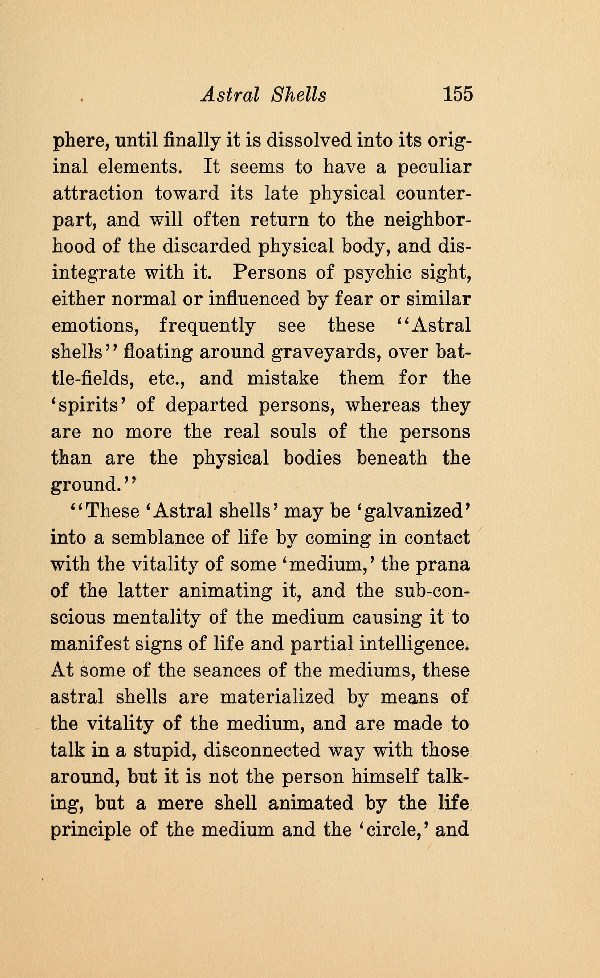until finally it is dissolved into its original elements. It seems to have a peculiar attraction toward its late physical counterpart, and will often return to the neighborhood of the discarded physical body, and disintegrate with it. Persons of psychic sight, either normal or influenced by fear or similar emotions, frequently see these "Astral shells" floating around graveyards, over battle-fields, etc., and mistake them for the `spirits' of departed persons, whereas they are no more the real souls of the persons than are the physical bodies beneath the ground."