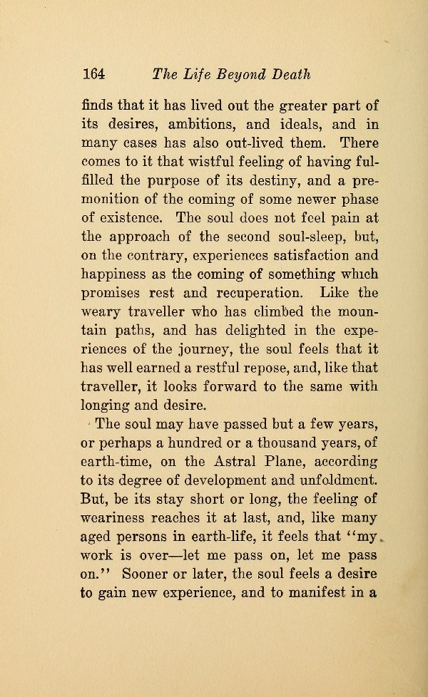 The soul may have passed but a few years, or perhaps a hundred or a thousand years, of earth-time, on the Astral Plane, according to its degree of development and unfoldment. But, be its stay short or long, the feeling of weariness reaches it at last, and, like many aged persons in earth-life, it feels that "my work is over --- let me pass on, let me pass on." Sooner or later, the soul feels a desire to gain new experience, and to manifest in a