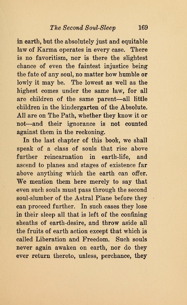 In the last chapter of this book, we shall speak of a class of souls that rise above further reincarnation in earth-life, and ascend to planes and stages of existence far above anything which the earth can offer. We mention them here merely to say that even such souls must pass through the second soul-slumber of the Astral Plane before they can proceed further. In such cases they lose in their sleep all that is left of the confining sheaths of earth-desire, and throw aside all the fruits of earth action except that which is called Liberation and Freedom. Such souls never again awaken on earth, nor do they ever return thereto, unless, perchance, they