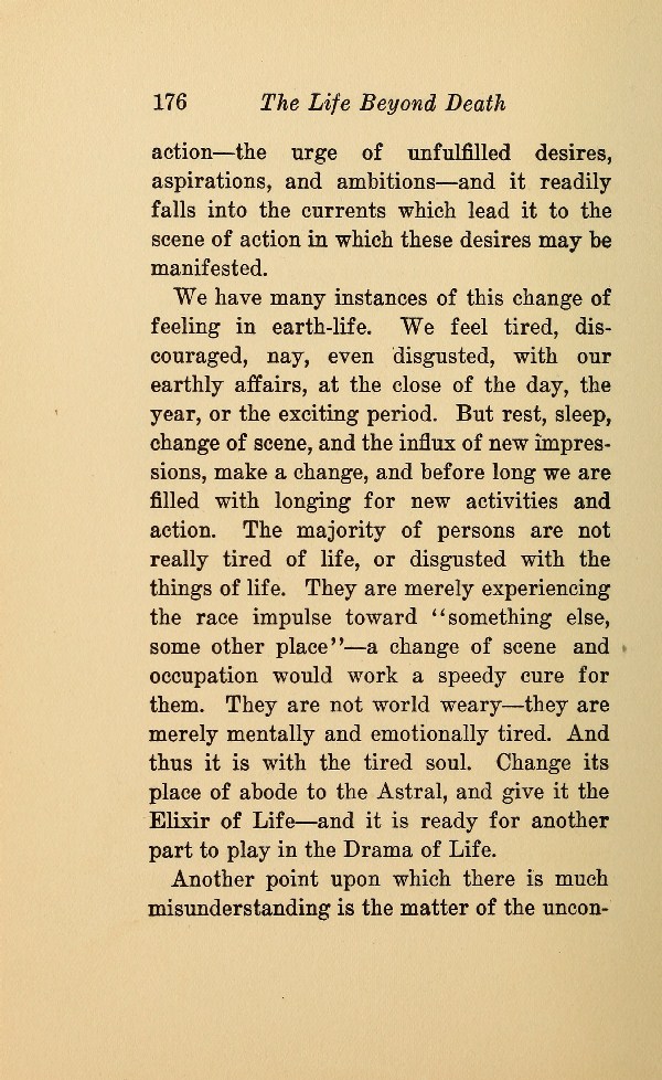 We have many instances of this change of feeling in earth-life. We feel tired, discouraged, nay, even disgusted, with our earthly affairs, at the close of the day, the year, or the exciting period. But rest, sleep, change of scene, and the influx of new impressions, make a change, and before long we are filled with longing for new activities and action. The majority of persons are not really tired of life, or disgusted with the things of life. They are merely experiencing the race impulse toward " something else, some other place " --- a change of scene and occupation would work a speedy cure for them. They are not world weary --- they are merely mentally and emotionally tired. And thus it is with the tired soul. Change its place of abode to the Astral, and give it the Elixir of Life --- and it is ready for another part to play in the Drama of Life.