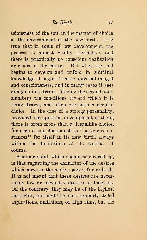 of the soul in the matter of choice of the environment of the new birth. It is true that in souls of low development, the process is almost wholly instinctive, and there is practically no conscious realization or choice in the matter. But when the soul begins to develop and unfold in spiritual knowledge, it begins to have spiritual insight and consciousness, and in many cases it sees dimly as in a dream, (during the second soulslumber) the conditions toward which it is being drawn, and often exercises a decided choice. In the case of a strong personality, provided the spiritual development is there, there is often more than a dreamlike choice, for such a soul does much to "make circumstances" for itself in its new birth, always within the limitations of its Karma, of course.