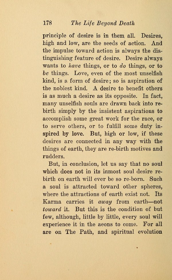 But, in conclusion, let us say that no soul which does not in its inmost soul desire rebirth on earth will ever be so re-born. Such a soul is attracted toward other spheres, where the attractions of earth exist not. Its Karma carries it away from earth --- not toward it. But this is the condition of but few, although, little by little, every soul will experience it in the aeons to come. For all are on The Path, and spiritual evolution