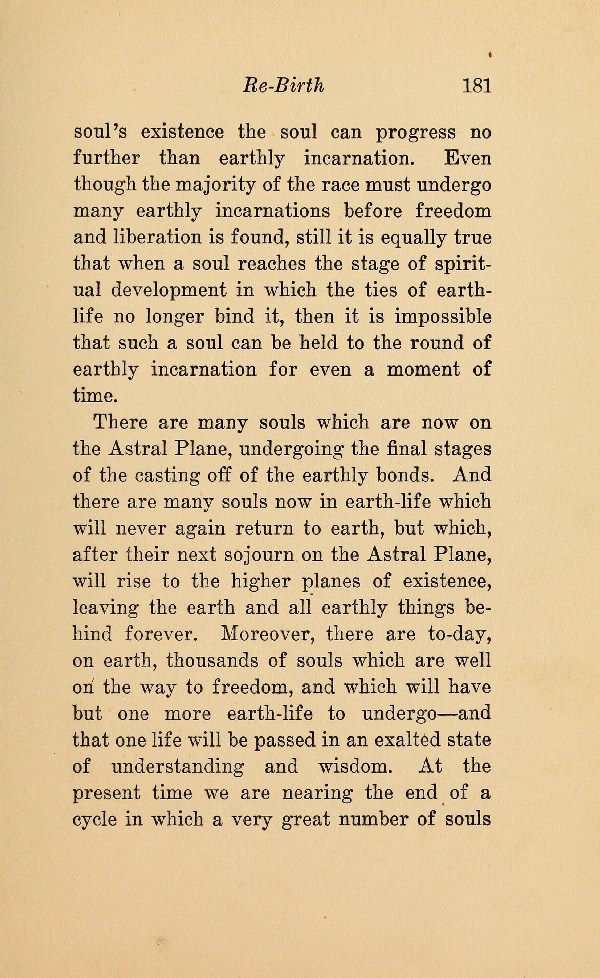There are many souls which are now on the Astral Plane, undergoing the final stages of the casting off of the earthly bonds. And there are many souls now in earth-life which will never again return to earth, but which, after their next sojourn on the Astral Plane, will rise to the higher planes of existence, leaving the earth and all earthly things behind forever. Moreover, there are to-day, on earth, thousands of souls which are well on the way to freedom, and which will have but one more earth-life to undergo --- and that one life will be passed in an exalted state of understanding and wisdom. At the present time we are nearing the end of a cycle in which a very great number of souls