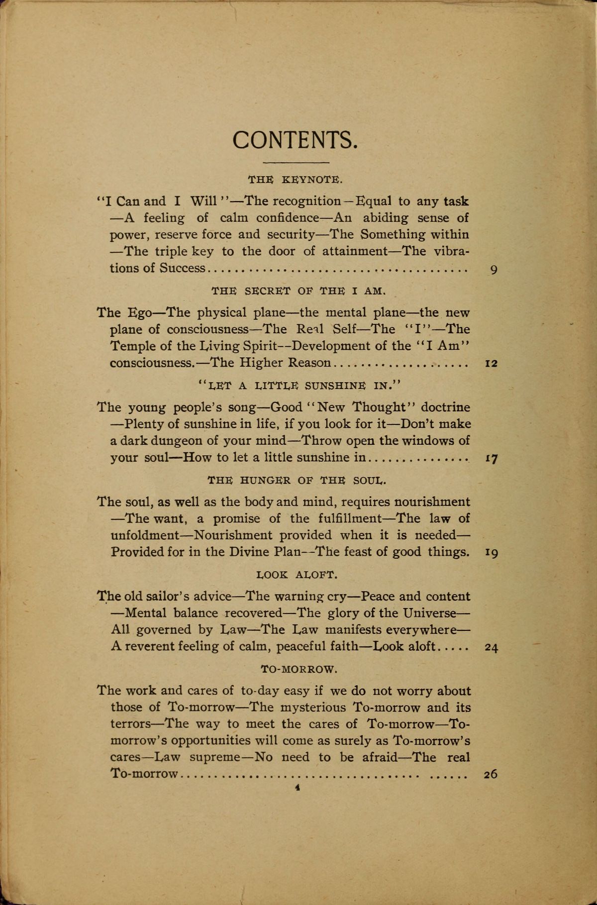 - THE KEYNOTE. - "I Can and I Will " --- The recognition --- Equal to any task --- A feeling of calm confidence --- An abiding sense of power, reserve force and security --- The Something within --- The triple key to the door of attainment --- The vibrations of Success - p. 9