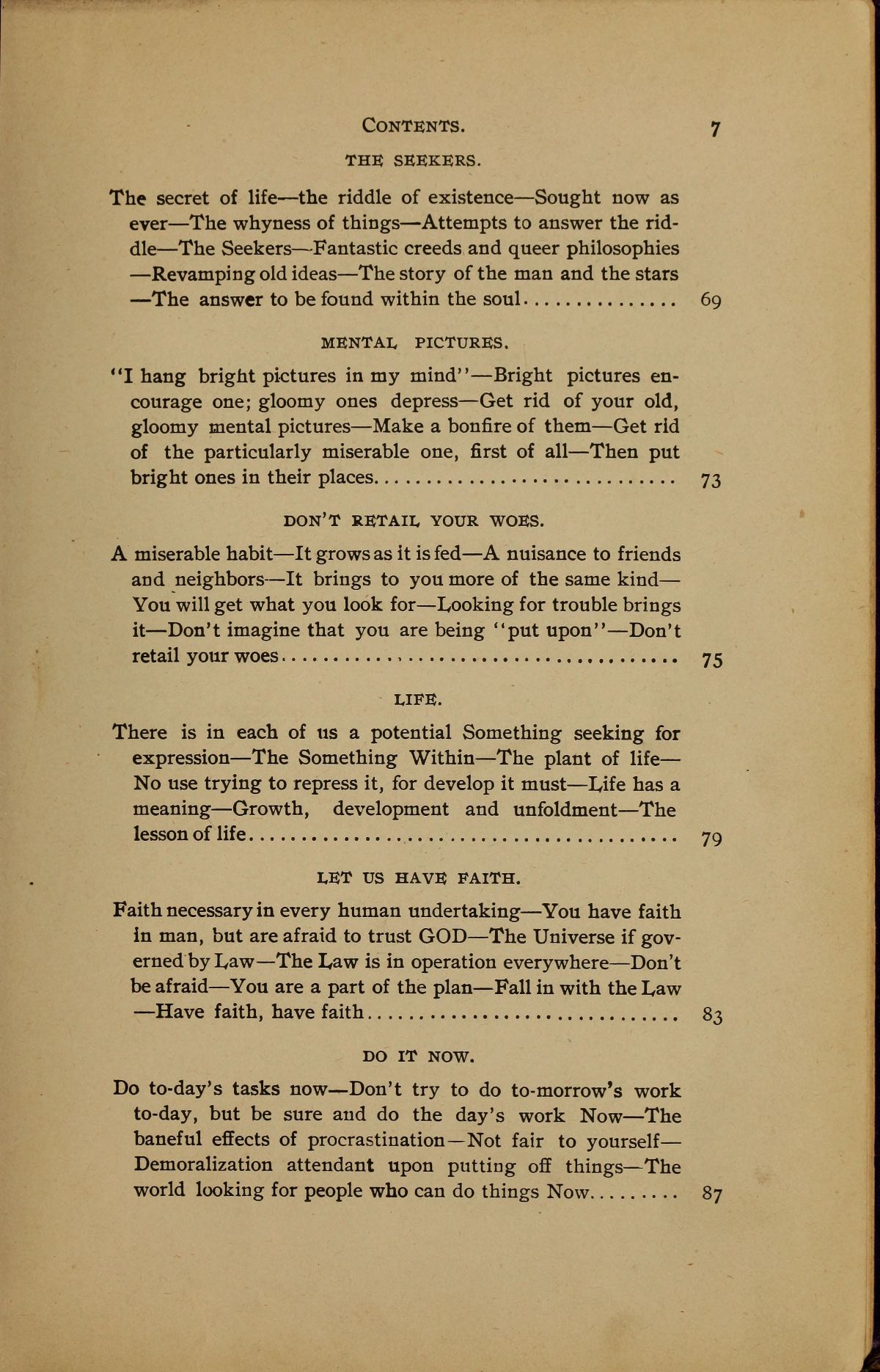 3. DON'T RETAIL YOUR WOES. - A miserable habit --- It grows as it is fed --- A nuisance to friends and neighbors --- It brings to you more of the same kind --You will get what you look for --- Rooking for trouble brings it --- Don't imagine that you are being "put upon" --- Don't retail your woes - p. 75