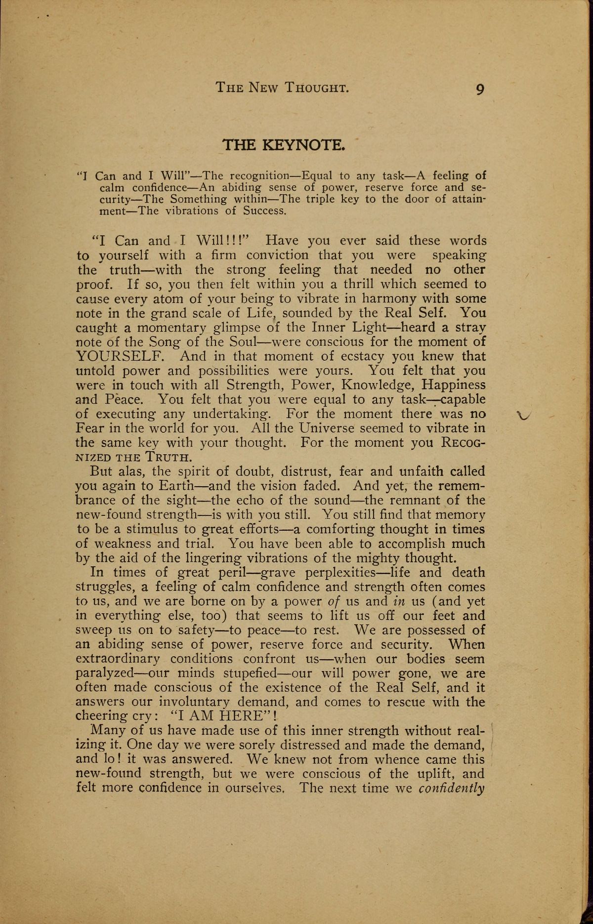 "I Can and I Will!!!" Have you ever said these words to yourself with a firm conviction that you were speaking the truth --- with the strong feeling that needed no other proof. If so, you then felt within you a thrill which seemed to cause every atom of your being to vibrate in harmony with some note in the grand scale of Life, sounded by the Real Self. You caught a momentary glimpse of the Inner Light --- heard a stray note of the Song of the Soul --- were conscious for the moment of YOURSELF. And in that moment of ecstacy you knew that untold power and possibilities were yours. You felt that you were in touch with all Strength, Power, Knowledge, Happiness and Peace. You felt that you were equal to any task --- capable of executing any undertaking. For the moment there was no Fear in the world for you. All the Universe seemed to vibrate in the same key with your thought. For the moment you Recognized the Truth.