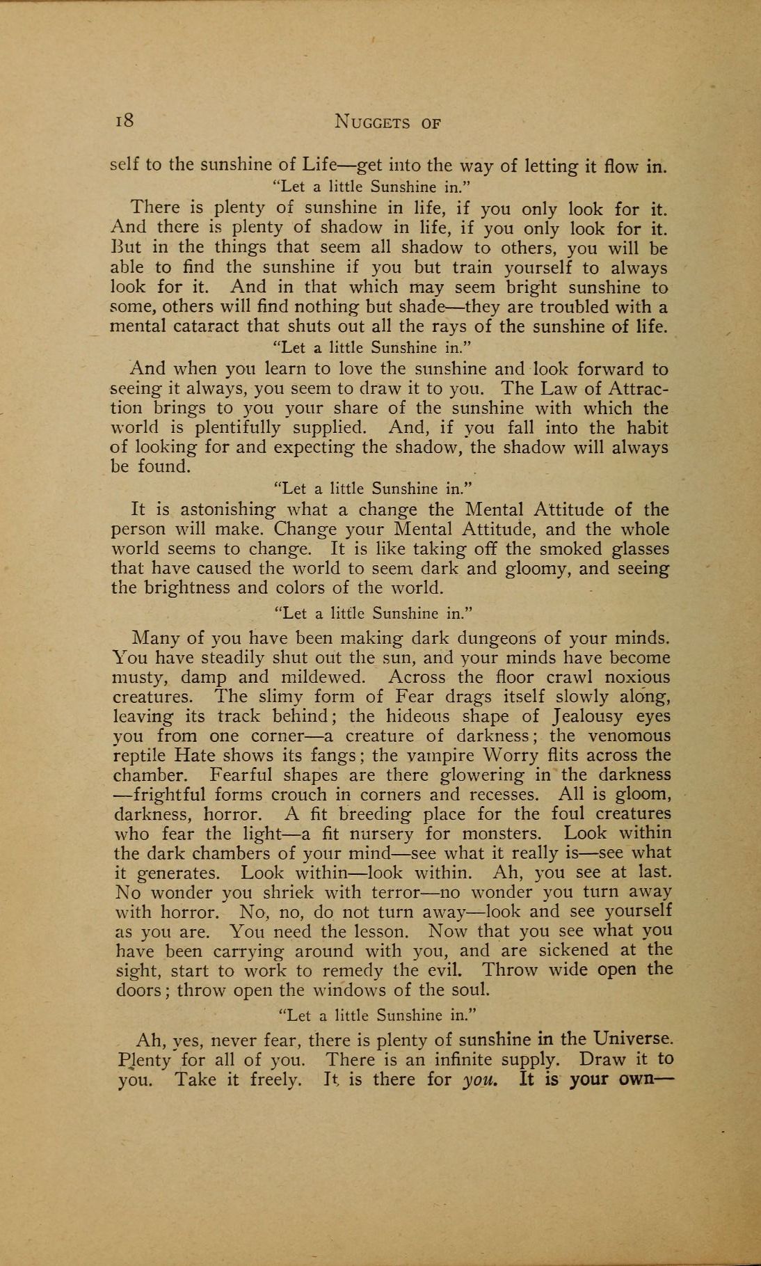 Many of you have been making dark dungeons of your minds. You have steadily shut out the sun, and your minds have become musty, damp and mildewed. Across the floor crawl noxious creatures. The slimy form of Fear drags itself slowly along, leaving its track behind; the hideous shape of Jealousy eyes you from one corner --- a creature of darkness; the venomous reptile Hate shows its fangs; the vampire Worry flits across the chamber. Fearful shapes are there glowering in the darkness --- frightful forms crouch in corners and recesses. All is gloom, darkness, horror. A fit breeding place for the foul creatures who fear the light --- a fit nursery for monsters. Look within the dark chambers of your mind --- see what it really is --- see what it generates. Look within --- look within. Ah, you see at last. No wonder you shriek with terror --- no wonder you turn away with horror. No, no, do not turn away --- look and see yourself as you are. You need the lesson. Now that you see what you have been carrying around with you, and are sickened at the sight, start to work to remedy the evil. Throw wide open the doors; throw open the windows of the soul. "Let a little Sunshine in."