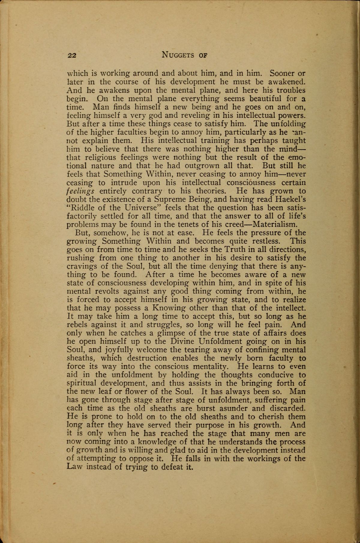which is working around and about him, and in him. Sooner or later in the course of his development he must be awakened. And he awakens upon the mental plane, and here his troubles begin. On the mental plane everything seems beautiful for a time. Man finds himself a new being and he goes on and on, feeling himself a very god and reveling in his intellectual powers. But after a time these things cease to satisfy him. The unfolding of the higher faculties begin to annoy him, particularly as he cannot explain them. His intellectual training has perhaps taught him to believe that there was nothing higher than the mind --that religious feelings were nothing but the result of the emotional nature and that he had outgrown all that. But still he feels that Something Within, never ceasing to annoy him --- never ceasing to intrude upon his intellectual consciousness certain feelings entirely contrary to his theories. He has grown to doubt the existence of a Supreme Being, and having readHaekel's "Riddle of the Universe" feels that the question has been satisfactorily settled for all time, and that the answer to all of life's problems may be found in the tenets of his creed --- Materialism.