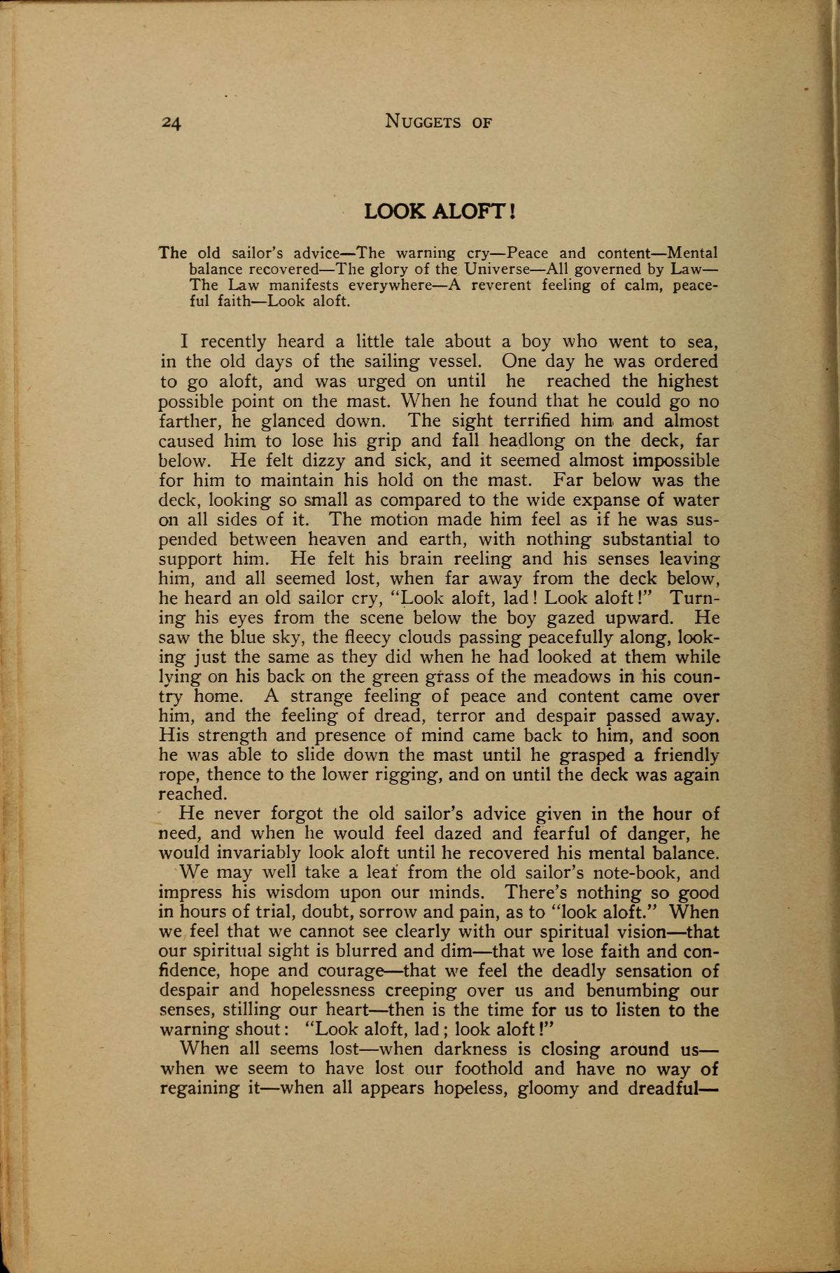 The old sailor's advice --- The warning cry --- Peace and content --- Mental balance recovered --- The glory of the Universe --- All governed by Law --The Law manifests everywhere --- A reverent feeling of calm, peaceful faith --- Look aloft.