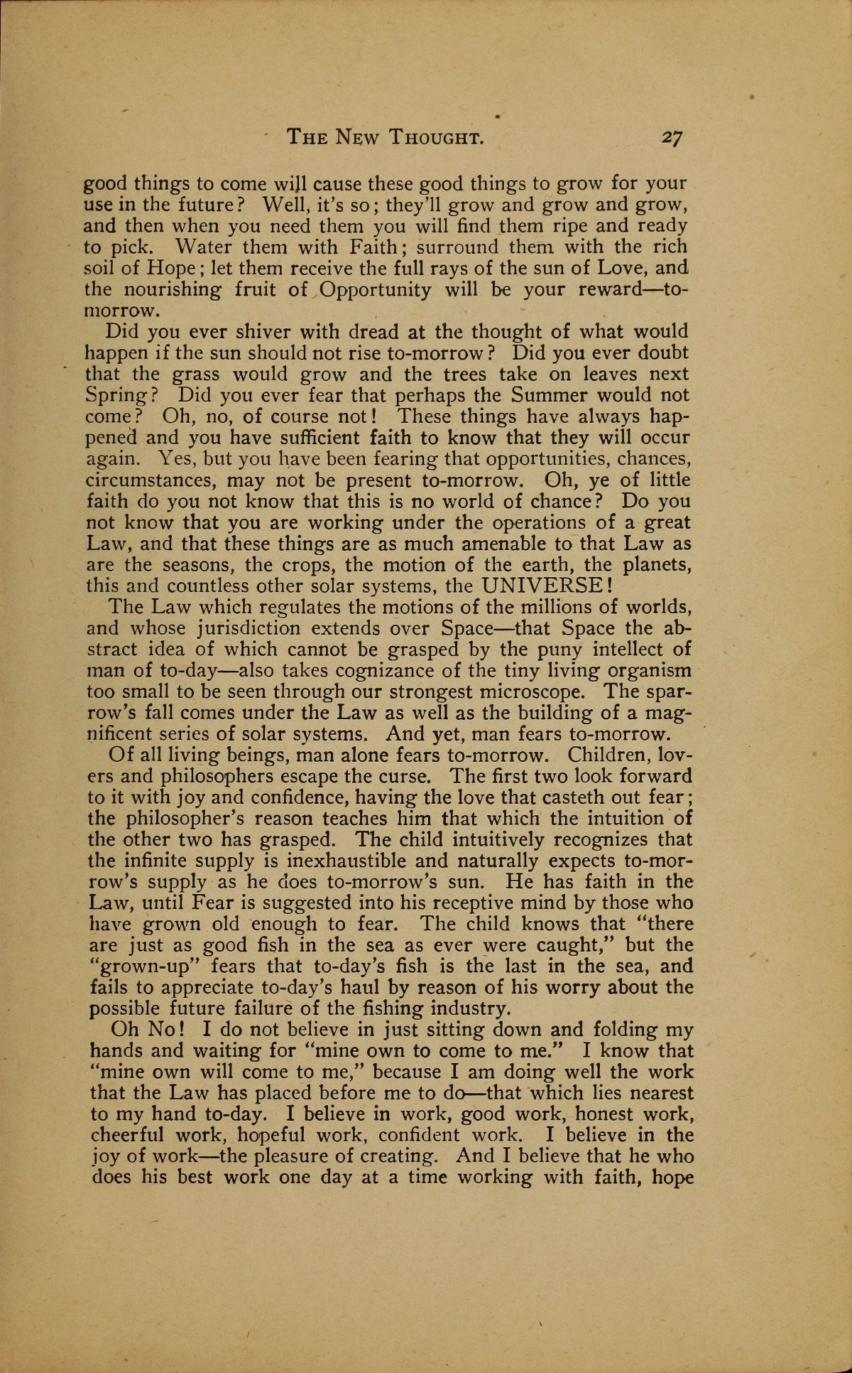 Did you ever shiver with dread at the thought of what would happen if the sun should not rise to-morrow? Did you ever doubt that the grass would grow and the trees take on leaves next Spring? Did you ever fear that perhaps the Summer would not come? Oh, no, of course not! These things have always happened and you have sufficient faith to know that they will occur again. Yes, but you have been fearing that opportunities, chances, circumstances, may not be present to-morrow. Oh, ye of little faith do you not know that this is no world of chance? Do you not know that you are working under the operations of a great Law, and that these things are as much amenable to that Law as are the seasons, the crops, the motion of the earth, the planets, this and countless other solar systems, the UNIVERSE!
