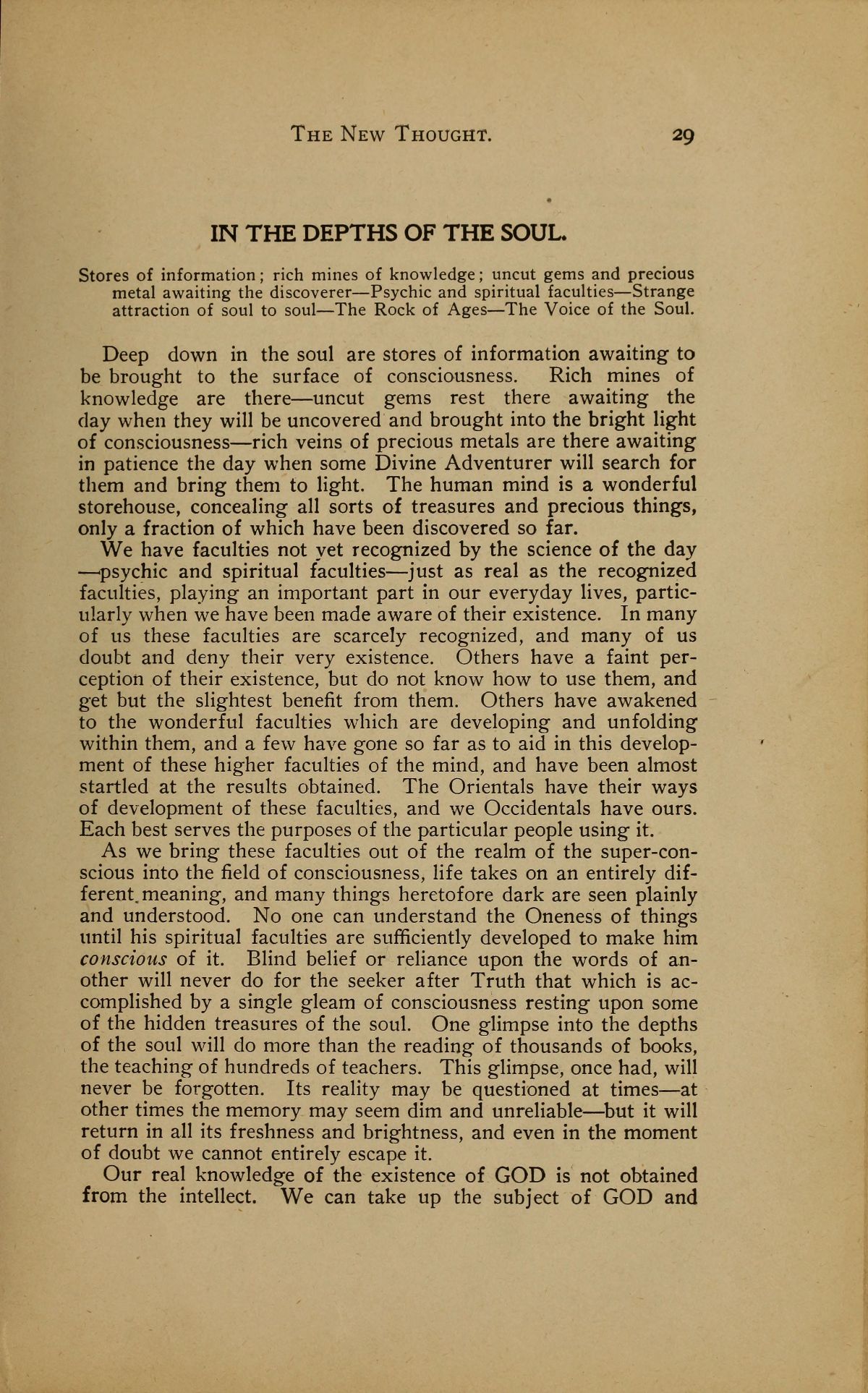 Stores of information; rich mines of knowledge; uncut gems and precious metal awaiting the discoverer --- Psychic and spiritual faculties --- Strange attraction of soul to soul --- The Rock of Ages --- The Voice of the Soul.