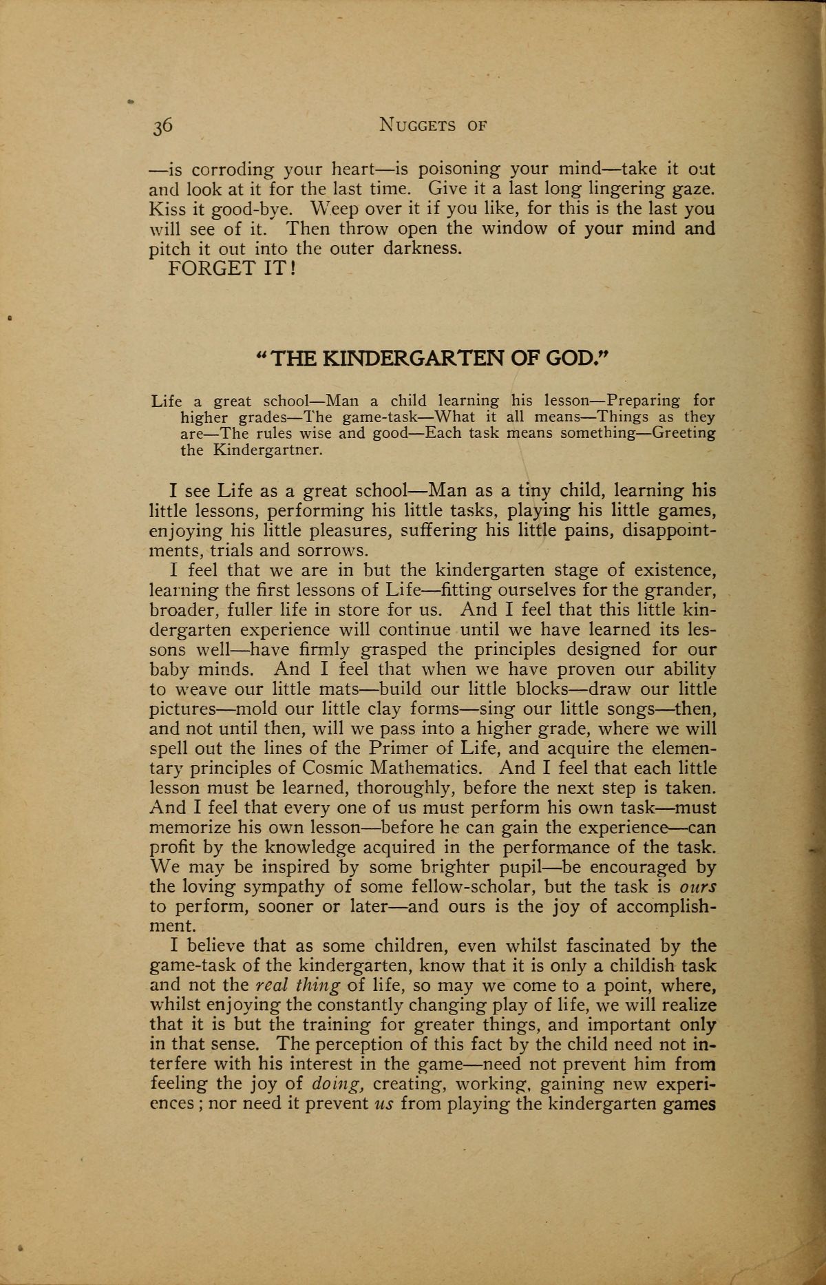 I feel that we are in but the kindergarten stage of existence, learning the first lessons of Life --- fitting ourselves for the grander, broader, fuller life in store for us. And I feel that this little kindergarten experience will continue until we have learned its lessons well --- have firmly grasped the principles designed for our baby minds. And I feel that when we have proven our ability to weave our little mats --- build our little blocks --- draw our little pictures --- mold our little clay forms --- sing our little songs --- then, and not until then, will we pass into a higher grade, where we will spell out the lines of the Primer of Life, and acquire the elementary principles of Cosmic Mathematics. And I feel that each little lesson must be learned, thoroughly, before the next step is taken. And I feel that every one of us must perform his own task --- must memorize his own lesson --- before he can gain the experience --- can profit by the knowledge acquired in the performance of the task. We may be inspired by some brighter pupil --- be encouraged by the loving sympathy of some fellow-scholar, but the task is ours to perform, sooner or later --- and ours is the joy of accomplishment.