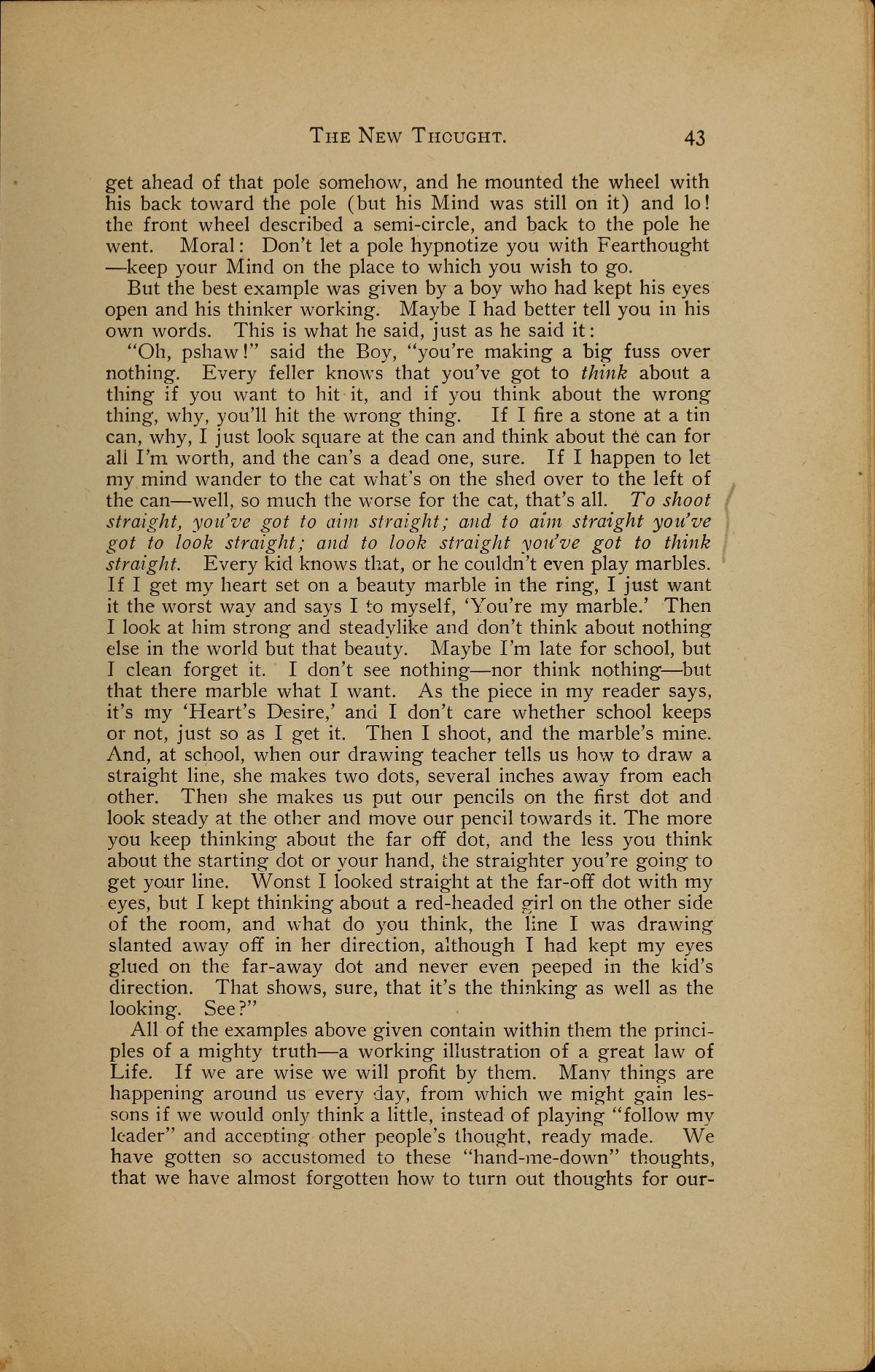 "Oh, pshaw!" said the Boy, "you're making a big fuss over nothing. Every feller knows that you've got to think about a thing if you want to hit it, and if you think about the wrong thing, why, you'll hit the wrong thing. If I fire a stone at a tin can, why, I just look square at the can and think about the can for all I'm worth, and the can's a dead one, sure. If I happen to let my mind wander to the cat what's on the shed over to the left of the can --- well, so much the worse for the cat, that's all. To shoot straight, you've got to aim straight; and to aim straight you've got to look straight; and to look straight you've got to think straight. Every kid knows that, or he couldn't even play marbles. If I get my heart set on a beauty marble in the ring, I just want it the worst way and says I to myself, 'You're my marble.' Then I look at him strong and steady like and don't think about nothing else in the world but that beauty. Maybe I'm late for school, but I clean forget it. I don't see nothing --- nor think nothing --- but that there marble what I want. As the piece in my reader says, it's my 'Heart's Desire,' and I don't care whether school keeps or not, just so as I get it. Then I shoot, and the marble's mine. And, at school, when our drawing teacher tells us how to draw a straight line, she makes two dots, several inches away from each other. Then she makes us put our pencils on the first dot and look steady at the other and move our pencil towards it. The more you keep thinking about the far off dot, and the less you think about the starting dot or your hand, the straighter you're going to get your line. Wonst I looked straight at the far-off dot with my eyes, but I kept thinking about a red-headed girl on the other side of the room, and what do you think, the line I was drawing slanted away off in her direction, although I had kept my eyes glued on the far-away dot and never even peeped in the kid's direction. That shows, sure, that it's the thinking as well as the looking. See?"