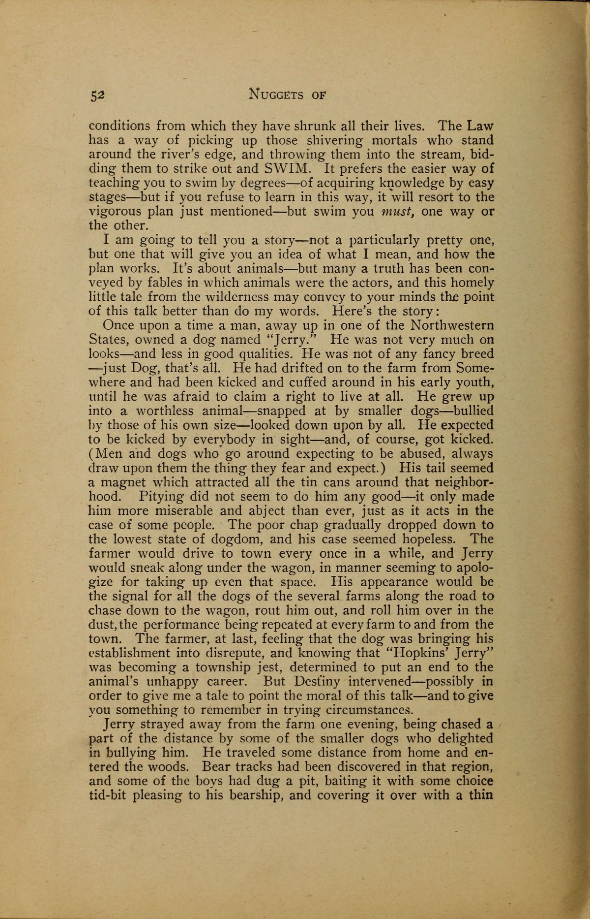 Once upon a time a man, away up in one of the Northwestern States, owned a dog named "Jerry." He was not very much on looks --- and less in good qualities. He was not of any fancy breed --- just Dog, that's all. He had drifted on to the farm from Somewhere and had been kicked and cuffed around in his early youth, until he was afraid to claim a right to live at all. He grew up into a worthless animal --- snapped at by smaller dogs --- bullied by those of his own size --- looked down upon by all. He expected to be kicked by everybody in sight --- and, of course, got kicked. (Men and dogs who go around expecting to be abused, always draw upon them the thing they fear and expect.) His tail seemed a magnet which attracted all the tin cans around that neighborhood. Pitying did not seem to do him any good --- it only made him more miserable and abject than ever, just as it acts in the case of some people. The poor chap gradually dropped down to the lowest state of dogdom, and his case seemed hopeless. The farmer would drive to town every once in a while, and Jerry would sneak along under the wagon, in manner seeming to apologize for taking up even that space. His appearance would be the signal for all the dogs of the several farms along the road to chase down to the wagon, rout him out, and roll him over in the dust, the performance being repeated at every farm to and from the town. The farmer, at last, feeling that the dog was bringing his establishment into disrepute, and knowing that "Hopkins' Jerry" was becoming a township jest, determined to put an end to the animal's unhappy career. But Destiny intervened --- possibly in order to give me a tale to point the moral of this talk --- and to give you something to remember in trying circumstances.