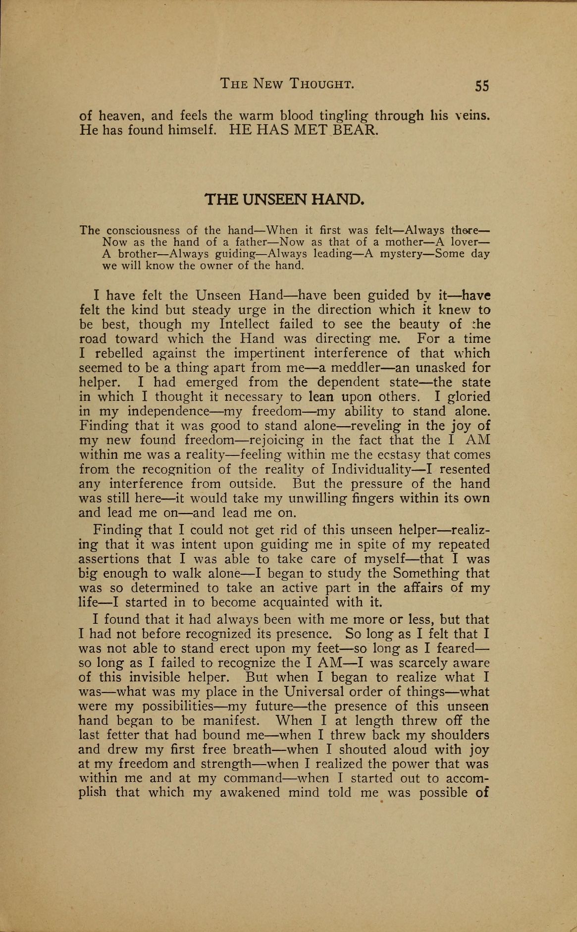 I have felt the Unseen Hand --- have been guided by it --- have felt the kind but steady urge in the direction which it knew to be best, though my Intellect failed to see the beauty of the road toward which the Hand was directing me. For a time I rebelled against the impertinent interference of that which seemed to be a thing apart from me --- a meddler --- an unasked for helper. I had emerged from the dependent state --- the state in which I thought it necessary to lean upon others. I gloried in my independence --- my freedom --- my ability to stand alone. Finding that it was good to stand alone --- reveling in the joy of my new found freedom --- rejoicing in the fact that the I AM within me was a reality --- feeling within me the ecstasy that comes from the recognition of the reality of Individuality --- I resented any interference from outside. But the pressure of the hand was still here --- it would take my unwilling fingers within its own and lead me on --- and lead me on.