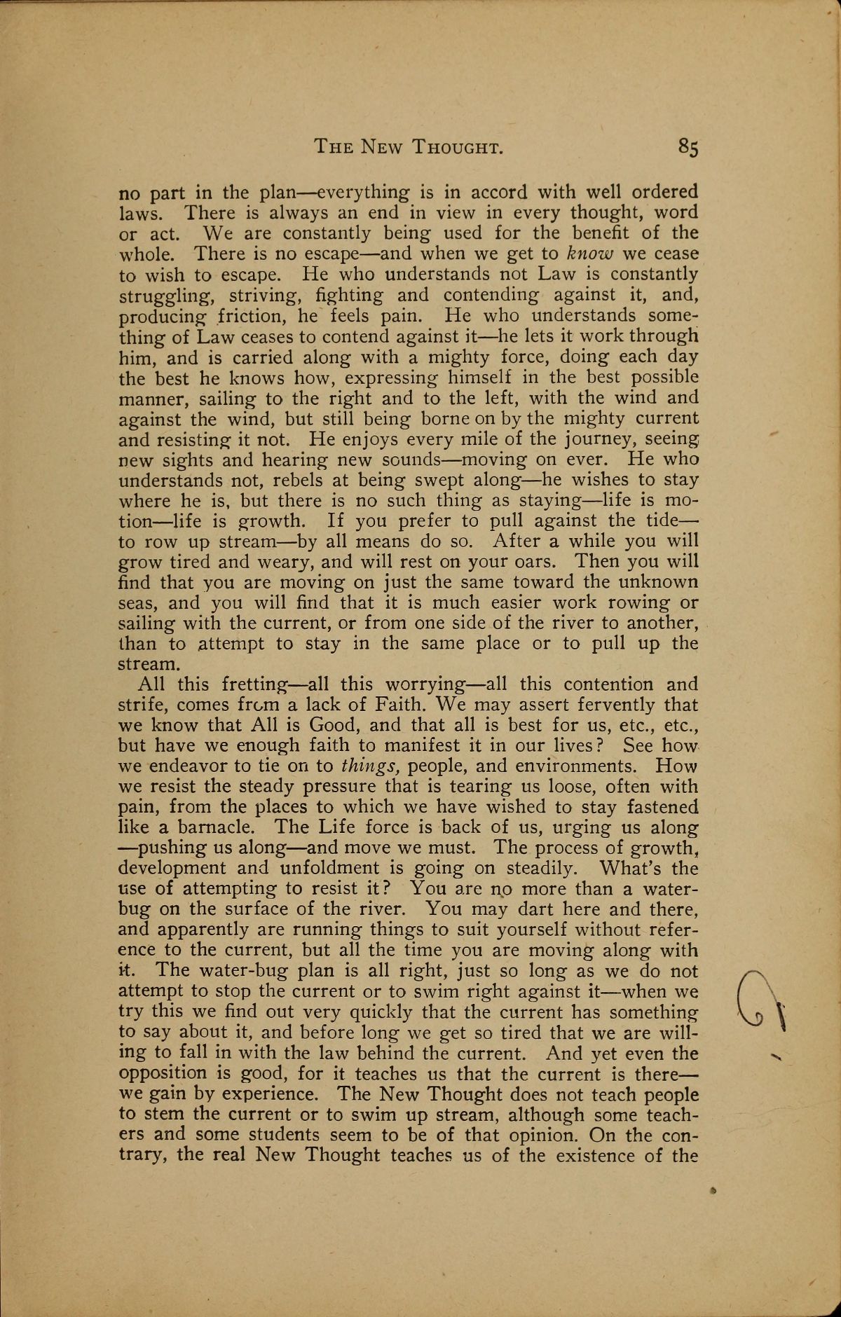 All this fretting --- all this worrying --- all this contention and strife, comes from a lack of Faith. We may assert fervently that we know that All is Good, and that all is best for us, etc., etc., but have we enough faith to manifest it in our lives? See how we endeavor to tie on to things, people, and environments. How we resist the steady pressure that is tearing us loose, often with pain, from the places to which we have wished to stay fastened like a barnacle. The Life force is back of us, urging us along --- pushing us along --- and move we must. The process of growth, development and unfoldment is going on steadily. What's the use of attempting to resist it? You are no more than a waterbug on the surface of the river. You may dart here and there, and apparently are running things to suit yourself without reference to the current, but all the time you are moving along with k. The water-bug plan is all right, just so long as we do not attempt to stop the current or to swim right against it --- when we try this we find out very quickly that the current has something to say about it, and before long we get so tired that we are willing to fall in with the law behind the current. And yet even the opposition is good, for it teaches us that the current is there --we gain by experience. The New Thought does not teach people to stem the current or to swim up stream, although some teachers and some students seem to be of that opinion. On the contrary, the real New Thought teaches us of the existence of the