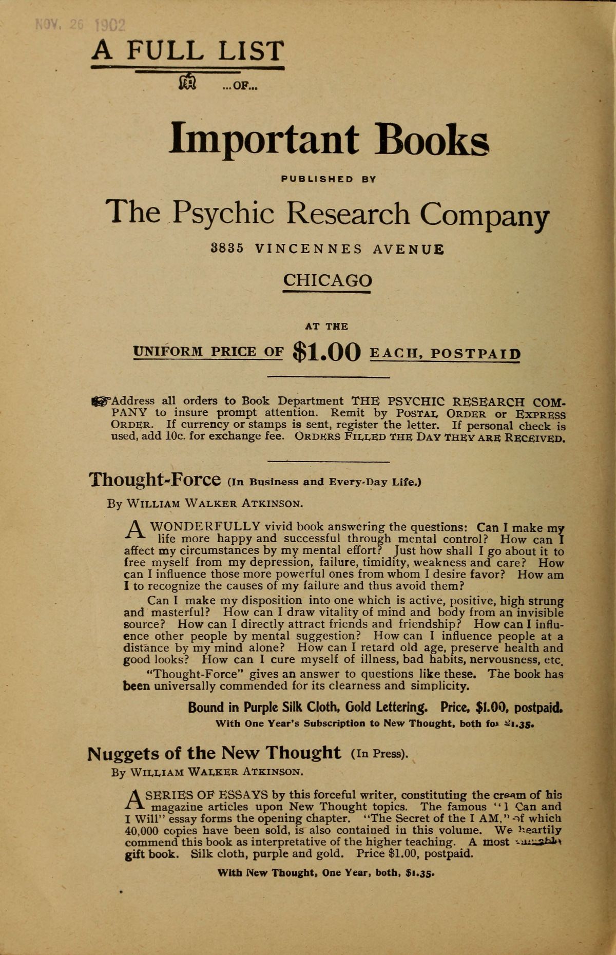 Address all orders to Book Department THE PSYCHIC RESEARCH COMPANY to insure prompt attention. Remit by Postal Order or Express Order. If currency or stamps is sent, register the letter. If personal check is used, add 10c. for exchange fee. Orders Filled the Day They are Received.