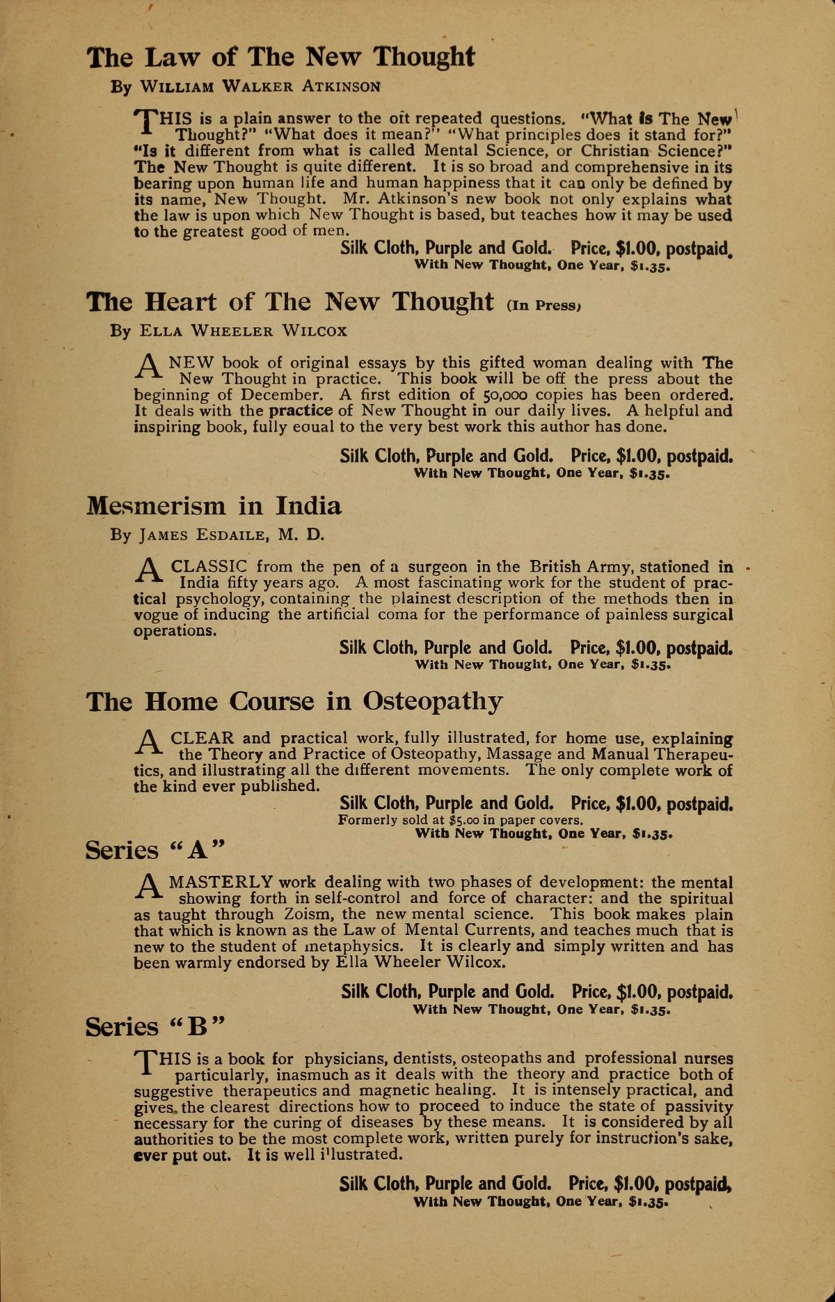 A NEW book of original essays by this gifted woman dealing with The **^ New Thought in practice. This book will be off the press about the beginning of December. A first edition of 50,000 copies has been ordered. It deals with the practice of New Thought in our daily lives. A helpful and inspiring book, fully equal to the very best work this author has done.