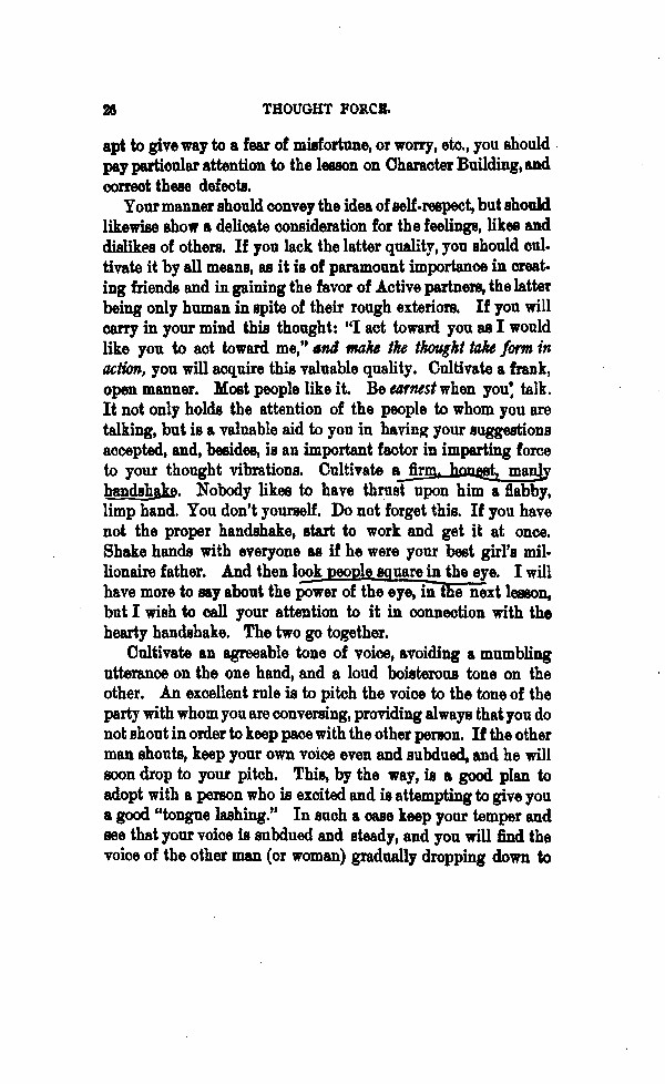 Cultivate a frank, open manner. Most people like it. Be earnest when you talk. It not only holds the attention of the people to whom you are talking, but is a valuable aid to you in having your suggestions accepted, and, besides, is an important factor in imparting force to your thought vibrations. Cultivate a firm, honest, manly handshake. Nobody likes to have thrust upon him a flabby limp hand. You don't yourself. Do not forget this. If you have not the proper handshake, start to work and get it at once. Shake hands with everyone as if he were your best girl's millionaire father. And then look people square in the eye. I will have more to say about the power of the eye, in the next lesson, but I wish to call your attention to it in connection with the hearty handshake. The two go together.