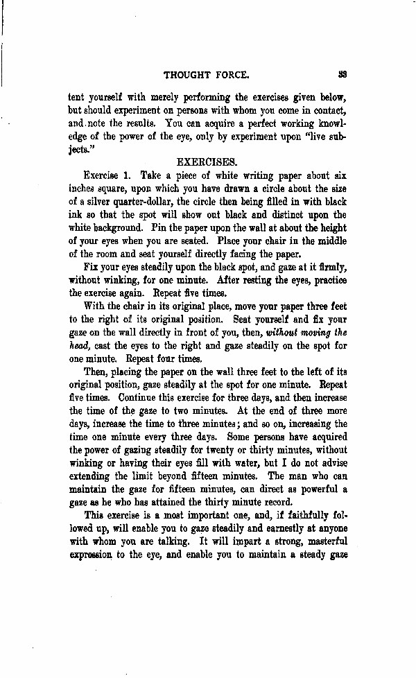 Then, placing the paper on the wall three feet to the left of its original position, gaze steadily at the spot for one minute. Repeat five times. Continue this exercise for three days, and then increase the time of the gaze to two minutes. At the end of three more days, increase the time to three minutes; and so on, increasing the time in one-minute increments every three days. Some persons have acquired the power of gazing steadily for twenty to thirty minutes, without winking or having their eyes fill with water, but I do not advise extending the limit beyond fifteen minutes. The man, who can maintain the gaze for fifteen minutes, can direct as powerful a gaze as he who has attained the thirty-minute record.