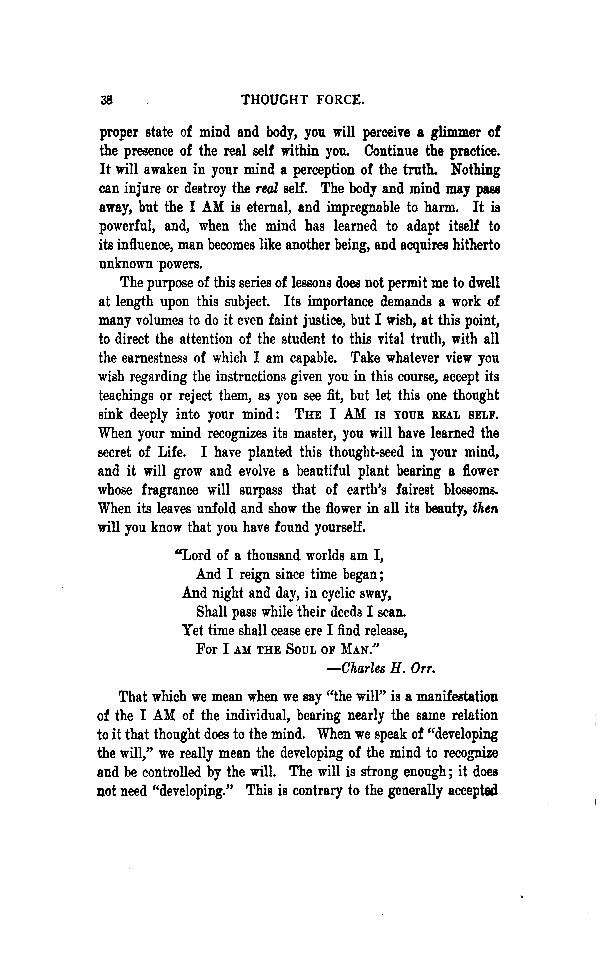 proper state of mind and body, you will perceive a glimmer of the presence of the real self within you. Continue the practice. It will awaken in your mind a perception of the truth. Nothing can injure or destroy the real self. The body and mind may pass away, but the "I AM" is eternal, and impregnable to harm. It is powerful, and, when the mind has learned to adapt itself to its influence, man becomes like another being, and acquire hither to unknown powers.