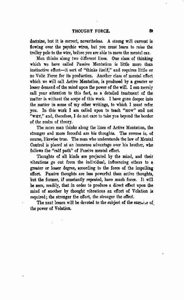 Man thinks along different lines. One class of thinking which we have called Passive Mentation is little more that instinctive effort - it sort of "thinks itself," and requires little or no Volic Force for its production. Another class of mental effort, which we will call Active Mentatioin, is produced by a greater or lesser demand of the mind upon the power of the will. I can merely call your attention to this fact, as a detailed treatment of the matter is without the scope of this work. I have gone deeper into you. In this work I am called upon to teach "How" and not "Why," and, therefore, I do not care to take you beyond the border of the realm of theory. The more man thinks along the lines of Active Mentation, the stronger and more forceful are his thoughts. The reverse is, of course, likewise true. The man who understands the law of Mental Control is placed at the immense advantage over his brother, who follows the "calf path" of Passive mental effort.