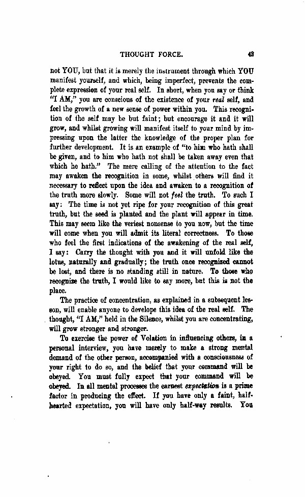 not YOU, but that is merely the instrument through which YOU manifest yourself, and which being imperfect, prevents the complete expression of your real self. In short, when you say or think "I AM," you are conscious of the existence of your real self, and feel the growth of a new sense of power within you. This recognition of the self may be but faint; but encourage it and it will grow, and whilst growing will manifest itself to your mind by impressing upon the latter the knowledge of the proper plan for further development. It is an example of "to him who hath shall be given, and to him who hast not shall be taken away even that which he hath." Their mere calling of the attention to the act may awaken the recognition in some, whilst others will find it necessary to reflect upon the idea and awaken to recognition of the truth more slowly. Some will not feel the truth. To such I say: the time is not yet ripe for your recognition of this great truth, but the seed is planted and the plant will appear in time. This may seem like the veriest nonsense to you now but the time will come when you will admit its literal correctness. To those who feel the first indications of the awakening of the real self, I say: Carry the thought with you and it will unfold like the lotus, naturally and gradually; the truth once recognized cannot be lost, and there is no standing still in nature. To those who recognize the truth, I would like to say more, but this is not the place.