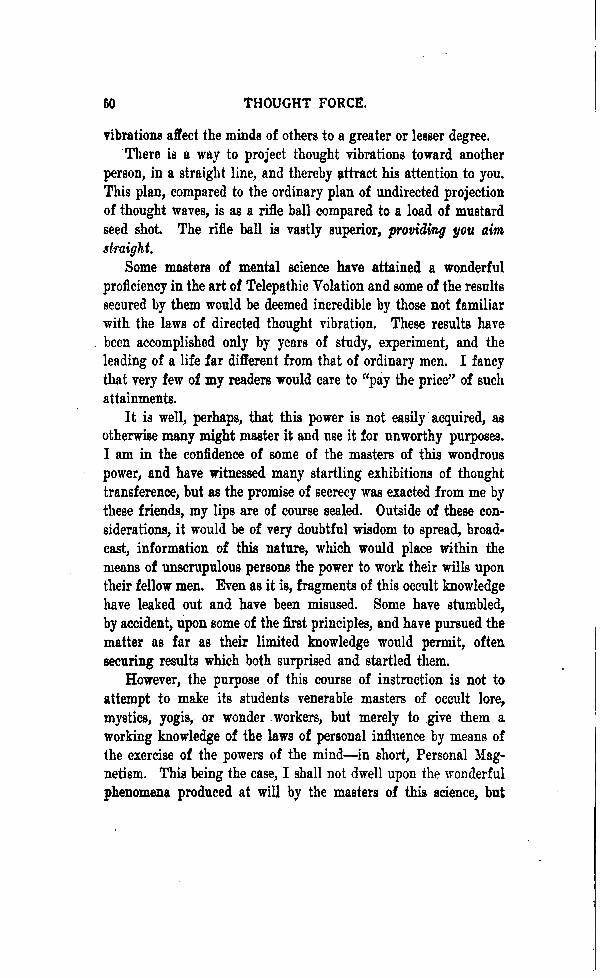 However, the purpose of this course of instruction is not to attempt to make its students venerable masters of occult lore, mystics, yogis, or wonder workers, but merely to give them a working knowledge of the laws of personal influence by means of the exercise of the powers of the mind - in short, Personal Magnetism. This being the case, I shall not dwell upon the wonderful phenomena produced at will by the masters of this science, but