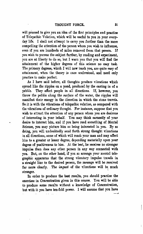 As I have said before, all thoughts produce vibrations, which spread like ripples on a pond, produced by the casting in of a pebble. They affect people in all directions. If, however, you throw the pebble along the surface of the water, their ripples will manifest their energy in the direction in which the stone travels. So it is with the vibrations of telepathic volation, as compared with the vibrations of ordinary thought. For instance, suppose that you wish to attract the attention of any person whom you are desirous of interesting in your behalf. You may think earnestly of your desire to interest him, and if you have read something of Mental Science, you may picture him as being interested in you. By so doing, you will undoubtedly send forth strong thought vibrations in all directions, some of which will reach your man and may affect him to a greater or lesser degree, depending materially upon your degree of positive-ness toward him. At the best, he receives no stronger impulse than does any other person in any way connected with you. But, on the other hand, if you so arrange your mental telepathic apparatus that the strong vibratory impulse travels in a straight line to the desired person, the message will be received far more clearly. The impact of the vibrations will be much stronger.