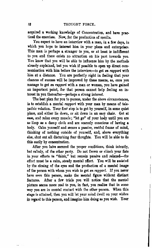You expect to have an interview with a man, in a few days, in which you hope to interest him in your plans and enterprises. This man is perhaps a stranger to you, or at least is indifferent to you and there exists no attraction on his part towards you. You know that you will be able to influence him by the methods already explained, but you wish, if possible, to open up direct communication with him before the interview - to get en rapport with him at a distance. You are perfectly right in feeling that your chances of success will be improved by these means, as once you manage to get en rapport with a man or woman, you have gained an important point, for that person cannot help feeling an interest in you thereafter - perhaps a strong interest.