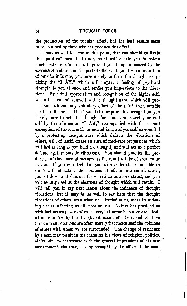I may as well tell you at this point, that you should cultivate the "positive mental attitude," as it will enable you to obtain much better results and will prevent your being influenced by the exercise of Volation on the part of others. If you feel an indication of outside influence, you have merely to form the thought recognizing the "I AM" which will impart a feeling of psychical strength to you at once, and render you impervious to the vibrations. By a full appreciation and recognition of the higher self, you will surround yourself with a thought aura, which will protect you, without any voluntary effort of the mind from outside mental influences. Until you fully acquire this recognition you merely have to hold the thought for a moment, assert your real self by the affirmation "I AM," accompanied with the mental conception of the real self. A mental image of yourself surrounded by a protecting thought aura which deflects the vibrations of others, will, of itself, create an aura which deflects the vibrations of others, will, of itself, create an aura of moderate proportions which will last as long as you hold the thought, and will act as a perfect defense against outside vibrations. You should practice the production of these mental pictures, as the results will be of great value to you. If you ever feel that you wish to be alone and able to think without taking the opinions of others into consideration; just sit down and shut out the vibrations as above stated, and you will be surprised at the clearness of thought which will result. I will tell you in my next lesson about the influence of thought vibrations of others, even when not directed at us, move in widening circles, affecting us all more or less. Nature had provided us with instinctive powers of resistance, but nevertheless we are affected more or less by the thought vibrations of others, and what we think are our opinions are often merely the consensus of the opinions of others with whom we are surrounded. The change of residence by a man may result in his changing his views of religion, politics, ethics, etc., to correspond with the general impressions of his new environment, the change being wrought by the effect of the combined
