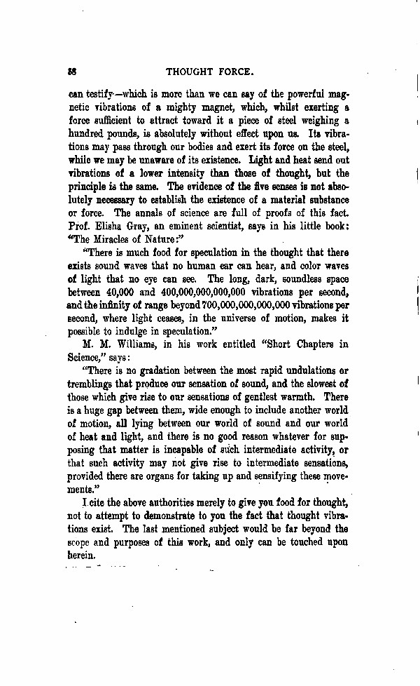 can testify - which is more than we can say of the powerful magnetic vibrations of a mighty magnet, which, whilst exerting a force sufficient to attract toward it a piece of steel weighing a hundred pounds, is absolutely without effect upon us. Its vibrations may pass through our bodies and exert its force on the steel, while we may be unaware of its existence. Light and heat send out vibrations of a lower intensity than those of thought, but the principle is the same. The evidence of the five senses is not absolutely necessary to establish the existence of a material substance or force. The annuals of science are full of proofs of this fact, Professor Elisha Gray, and eminent scientist, says in his little book: