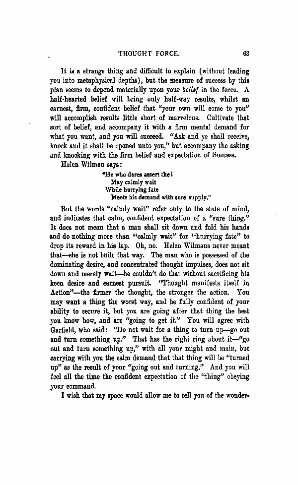 But the words "calmly wait" refer only to the state of mind - and indicates that calm, confident expectation of a "sure thing." It does not mean that a man shall sit down and fold his hands and do nothing more than "calmly wait" for "hurrying fat" to drop his reward in his lap. Oh, no. Helen Wilmans never meant that - she is not built that way. The man, who is possessed of the dominating desire, and concentrated thought impulses, does not sit down and merely wait - he couldn't do that without sacrificing his keen desire and earnest pursuit. "Thought manifests itself in Action" - the firmer the thought, the stronger the action. You may want a thing in the worst way, and be fully confident of your ability to secure it, but you are going after that thing the best way you know how, and are "going to get it." You will agree with Garfield, who said, "Do not wait for a thing to turn up - go out and turn something up," with all your might and main, but carrying with you the calm demand that that thing will be "turned up as the result of your going out and turning." And you will feel all the time the confident expectation of the "thing" obeying your command.