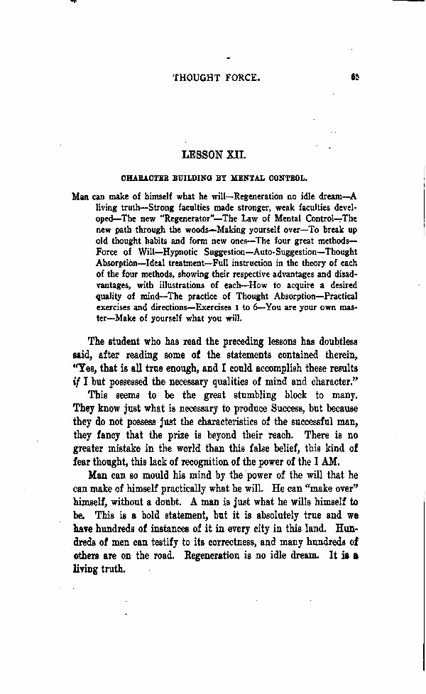 Man can make of himself what he will - Regeneration no idle dream - A living truth - Strong faculties made stronger, weak faculties developed - The new "Regenerator" - The Law of Mental Control - The new path through the woods - Making yourself over - To break up old thought habits and form new ones - The four great methods - Force of Will - Hypnotic Suggestion - Auto Suggestion - Thought Absorption - Ideal treatment - Full instruction in the theory of each of the four methods, showing their respective advantages and disadvantages, with illustrations of each - How to acquire a desired quality of mind - The practice of Thought Absorption - Practical exercises and directions - Exercises 1 to 6 - You are your own master - Make of yourself what you will.