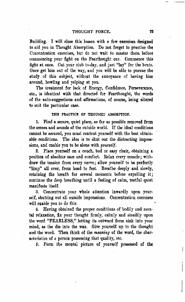Building. I will close this lesson with a few exercises designed to aid you in Thought Absorption. Do not forget to practice the Concentration exercises, but do not wait to master them before commencing your fight on the Fear thought cur. Commence this flight at once. Cut your club today, and just "lay" for the brute. Once you get him out of the way, you will be able to pursue the study of this subject, without the annoyance of having him around, howling and yelping at you. The treatment for lack of Energy, Confidence, Perseverance, etc., is identical with that directed for Fear thought, the words of the auto-suggestions and affirmations, of course, being, altered to suit the particular case.