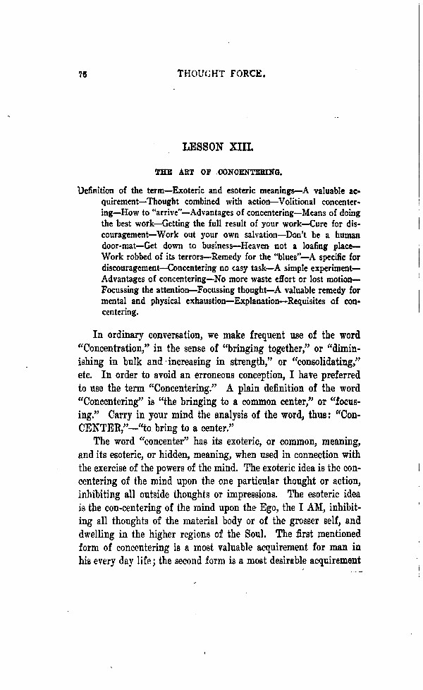 Definition of the term - Exoteric and esoteric meanings - A valuable acquirement - Thought combined with action - Volitional concentering - How to "arrive" - Advantages of concentering - Means of doing the best work - Getting the full result of your work - Cure for discouragement - Work out your own salvation - Don't be a human doormat - Get down to business "Heaven's" not a loafing place - Work robbed of its terrors - Remedy for the "blues" - A specific for discouragement - Concentering no easy task - A simple experiment - Advantages of concentering - No more waste effort or lost motion - Focusing the attention - Focusing thought - A valuable remedy for mental and physical exhaustion - Explanation - Requisites of concentering.