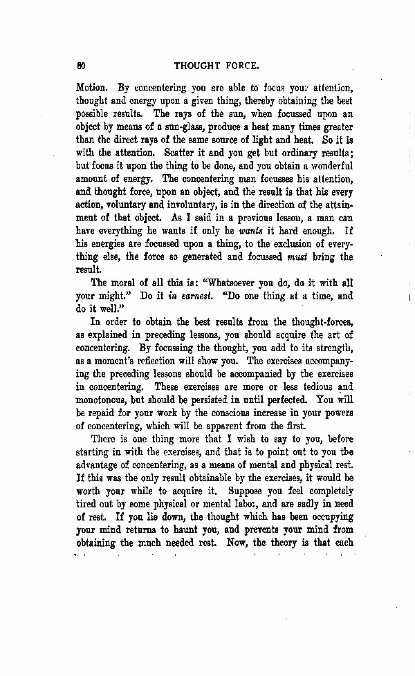 Motion. By concentering you are able to focus your attention, thought and energy upon a given thing, thereby obtaining the best possible results. The rays of the sun, when focused upon an object by means of a sunglass, produce a heat many time greater that the direct relay of the same source of light and heat. So it is with that attention. Scatter it and you get but ordinary results; but focus it upon the thing to be done, and you obtain a wonderful amount of energy. The concentering man focuses his attention, and thought force, upon an object, and the result is that his every action, voluntary and involuntary, is in the direction of the attainment of that object. As I said in a previous lesson, a man can have everything he wants if only he wants it hard enough. If his energies are focused upon a thing, to the exclusion of everything else, the force so generated and focused must bring the result.