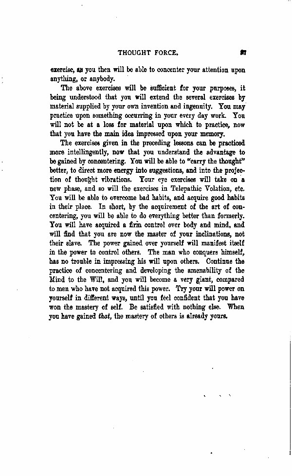 The exercises given in the preceding lessons can be practiced more intelligently, now that you understand the advantage to be gained by concentering. You will be able to "carry the thought" better, to direct more energy into suggestions, and into the projection of thought vibrations. Your eye exercises will take on a new phase, and so will the exercises in Telepathic Volation, etc. You will be able to overcome bad habits, and acquire good habits in their place. In short, by the acquirement of the art of concentering, you will be able to do everything better than formerly. You will have acquired a firm control over body and mind, and will find that you are now the master of your inclinations, not their slave. The power gained over yourself will manifest itself in the power to control others. The man, who conquers himself, has no trouble in impressing his will upon others. Continue the practice of concentering and developing the amenability of the Mind to the Will, and you will become a giant, compared to men who have not acquired this power. Try your will power on yourself in different ways, until you feel confident that you have won the mastery of self. Be satisfied with nothing else. When you have gained that, the mastery of others is already yours.