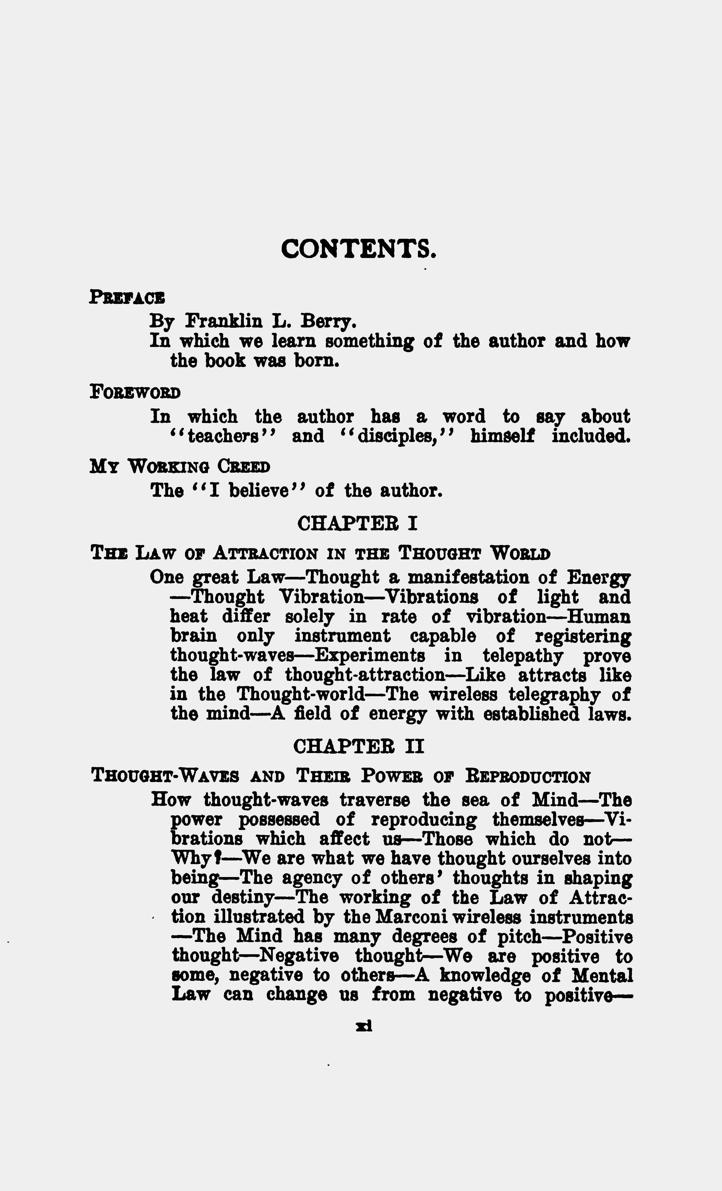 - Worry the child of Fear --- The motive underlying action --- The causes that result in Success --- How Desire acts --- Worry negative and death producing --- Desire and Ambition positive and life producing --- The transmutation of Worry --- Getting into harmony with the right thought waves --- Setting in motion the Law of Attraction --- Fear paralyzes Desire --- Once rid of it, difficulty melts away --- The working of a mighty Law --- The things we worry about --- Thngs just themselves --- The storing up of energy --- Where are the feared things? --- Better ways of overcoming objectionable thought than by fighting them.