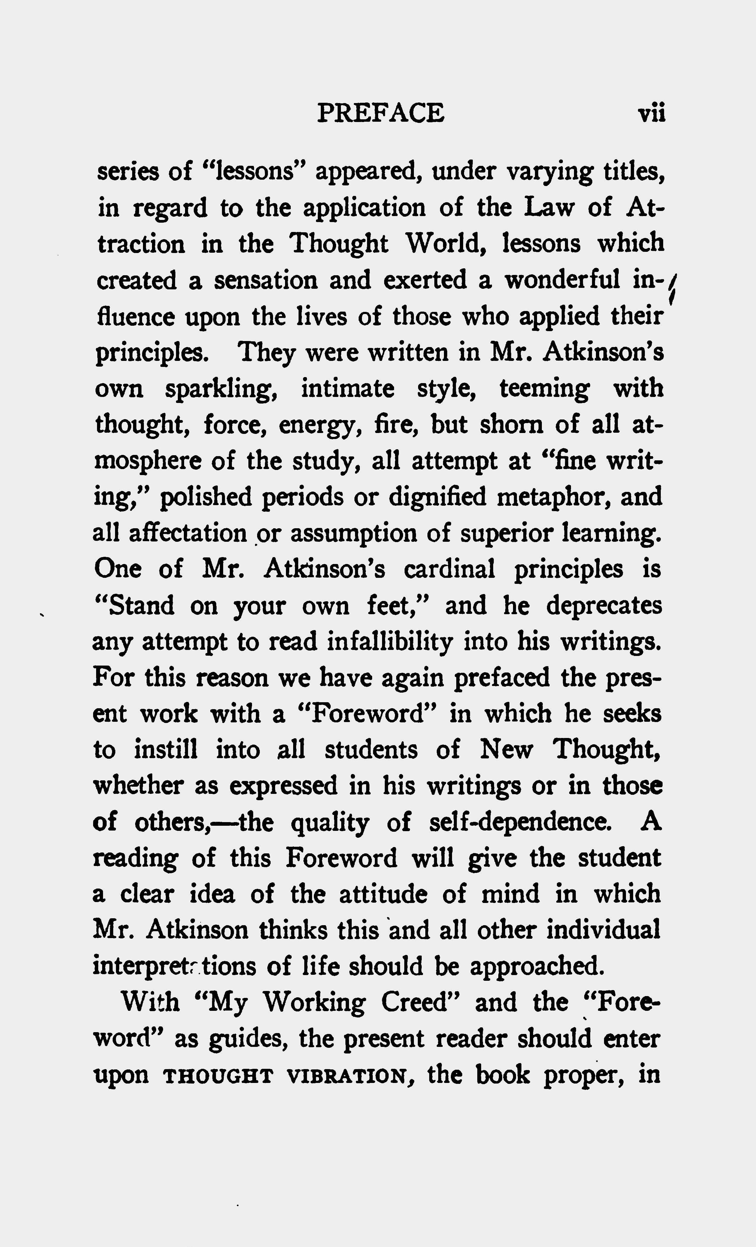 With "My Working Creed" and the "Foreword" as guides, the present reader should enter upon THOUGHT VIBRATION, the book proper, in