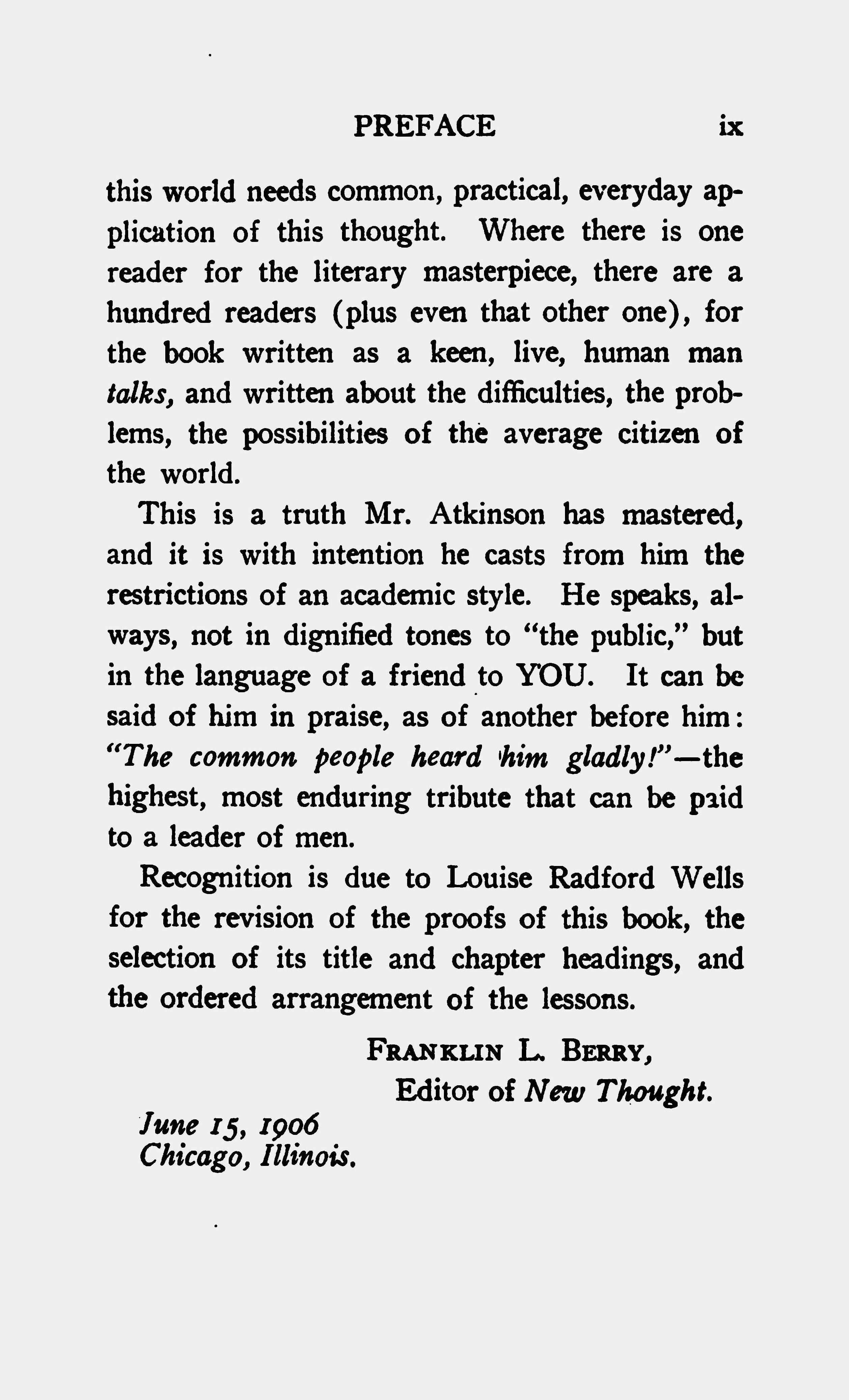 This is a truth that Mr. Atkinson has mastered, and it is with intention he casts from him the restrictions of an academic style. He speaks, always, not in the dignified tones to "the public," but in the language of a friend to YOU. It can be said of him and praise, as of another before him: "The common people heard him gladly!" --- The highest, most enduring tribute that can be paid to a leader of men.