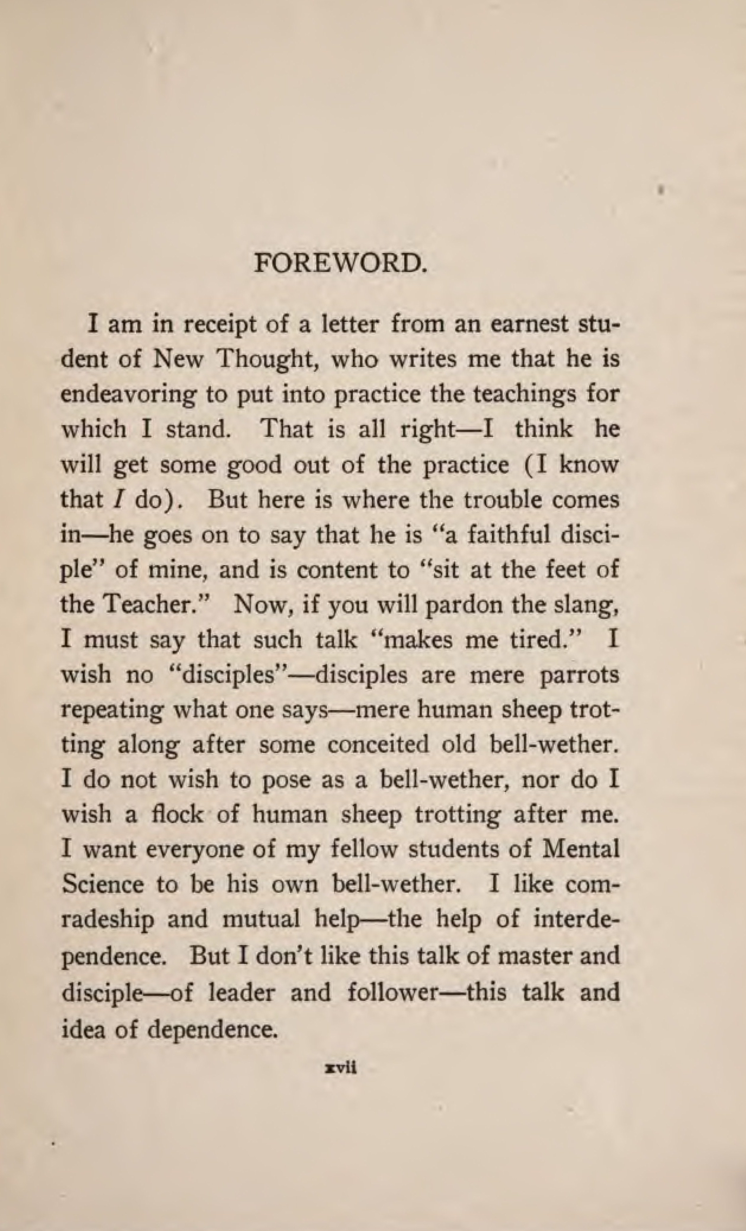 I am in her seat of a letter from an earnest student of new thought, who writes me that he is endeavoring to put into practice the teachings for which I stand. That is all right ---- I think you'll get some good out of the practice ( I know that I do). But here is where the trouble comes in --- he goes on to say that he is "a faithful disciple" of mine, and is content to "sit at the feet of the Teacher." Now, if you'll pardon the slang, I must say that such talk "make me tired." I wish no "disciples" --- disciples are mere parrots repeating what one says --- mere human sheep trotting along after some conceited old bellwether. I do not wish to pose as a bellwether, nor do I wish a flock of human sheep trotting after me. I want every one of my fellow students of mental science to be his own bellwether. I like comradeship and mutual help --- the help of interdependence. But I don't like this talk of master and disciple --- of leader and follower --- this talk and idea of dependence.