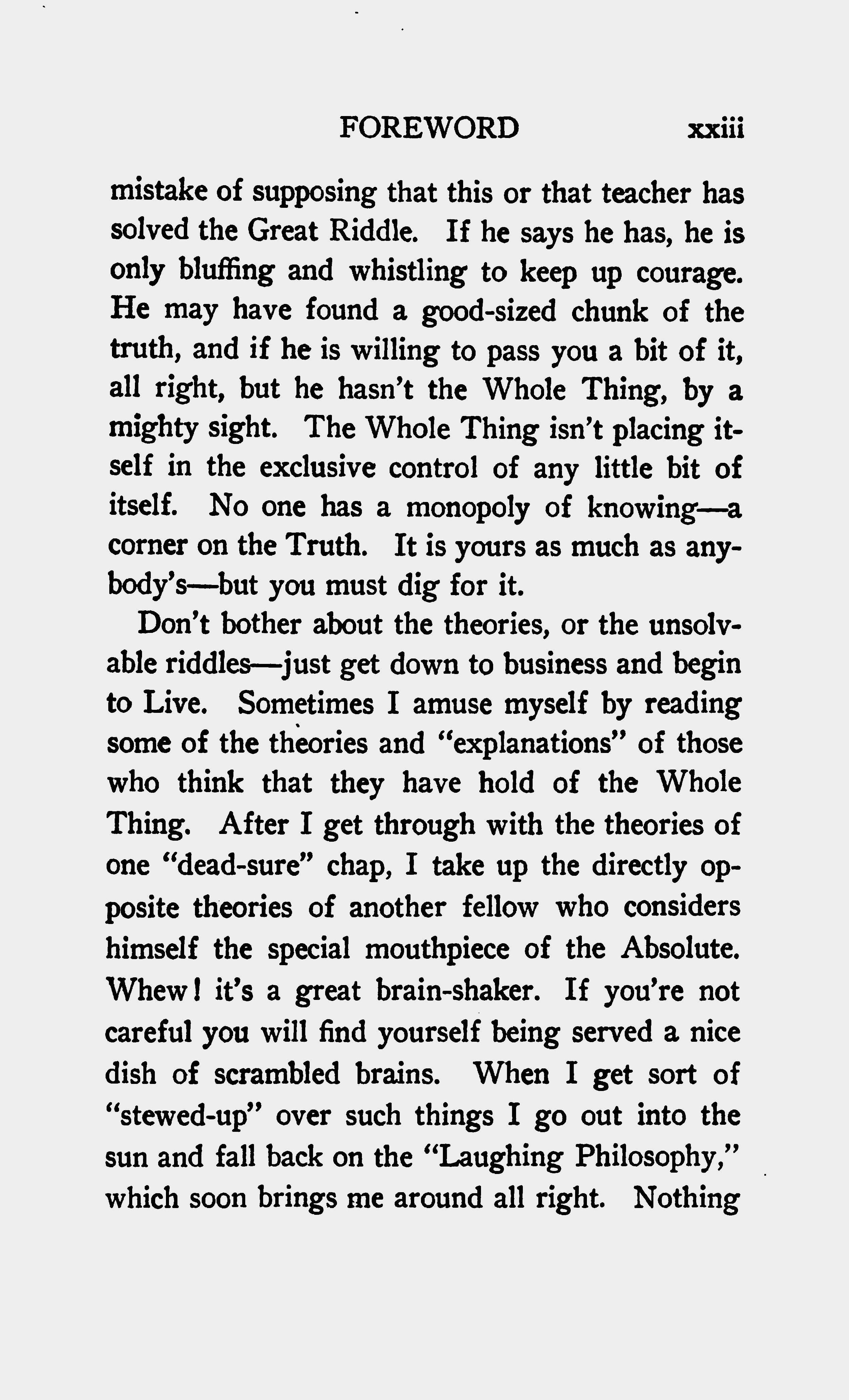 Don't bother about the theories, or the unsolvable riddles --- just get down to business and begin to Live. Sometimes I must amuse myself by reading some of the theories and "explanations" of those who think they have hold of the Whole Thing. After I get through with the theories of one "dead-sure" chap, I take up the directly opposite theories of another fellow who considers himself the special mouthpiece of the Absolute. Whew! it's a great brain shaker. if you're not careful you will find yourself being served a nice dish of scrambled brains. When I get sort of "stewed-up" over such things I go out into the sun and fall back on the "Laughing Philosophy," which then brings me around all right. Nothing