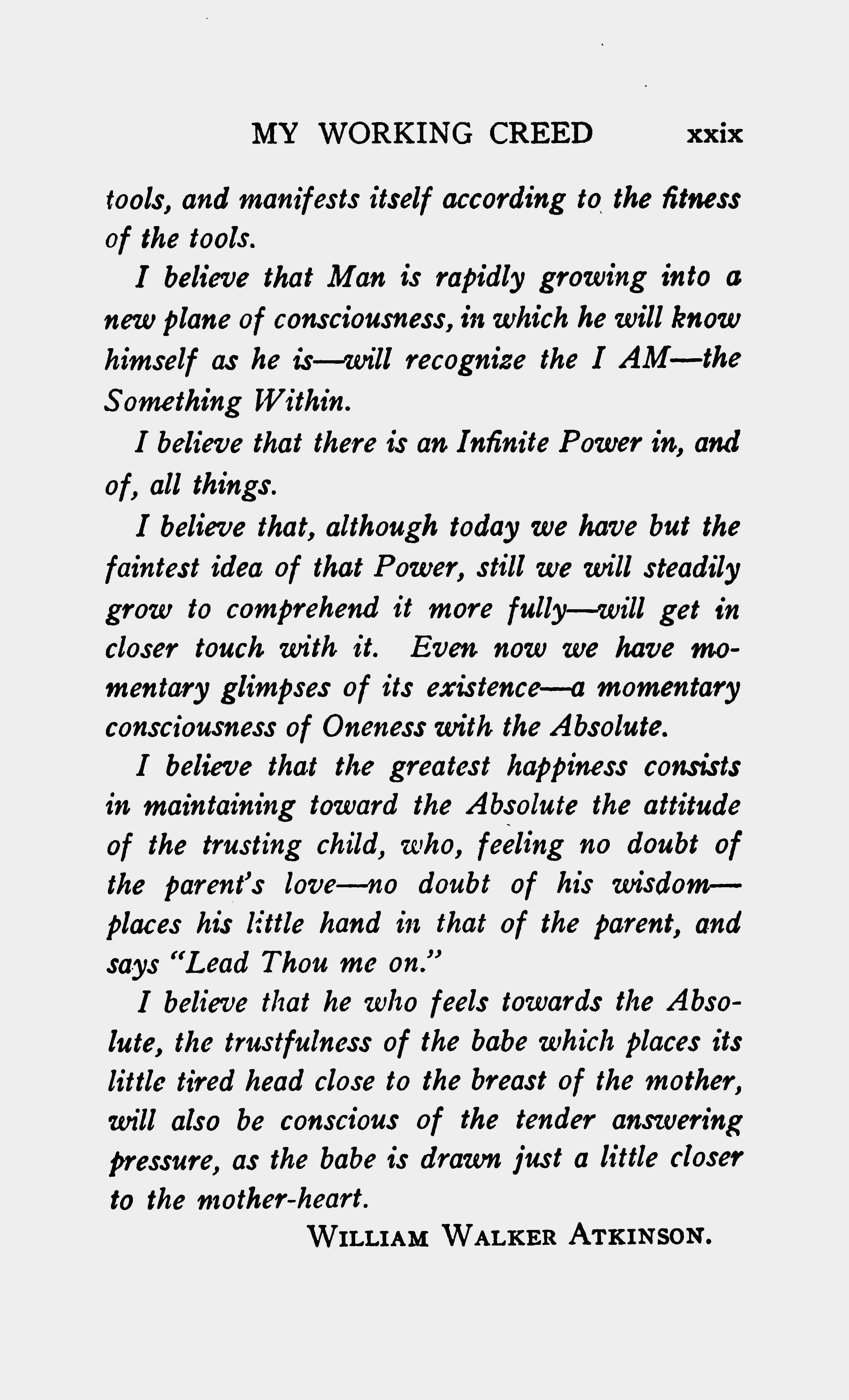 I believe that he feels towards the Absolute, the trust fullness of the babe which places its little tired head close to the breast of the mother, will also be conscious of the tender answering pressure, as the babe is drawn just a little closer to the mother-heart.