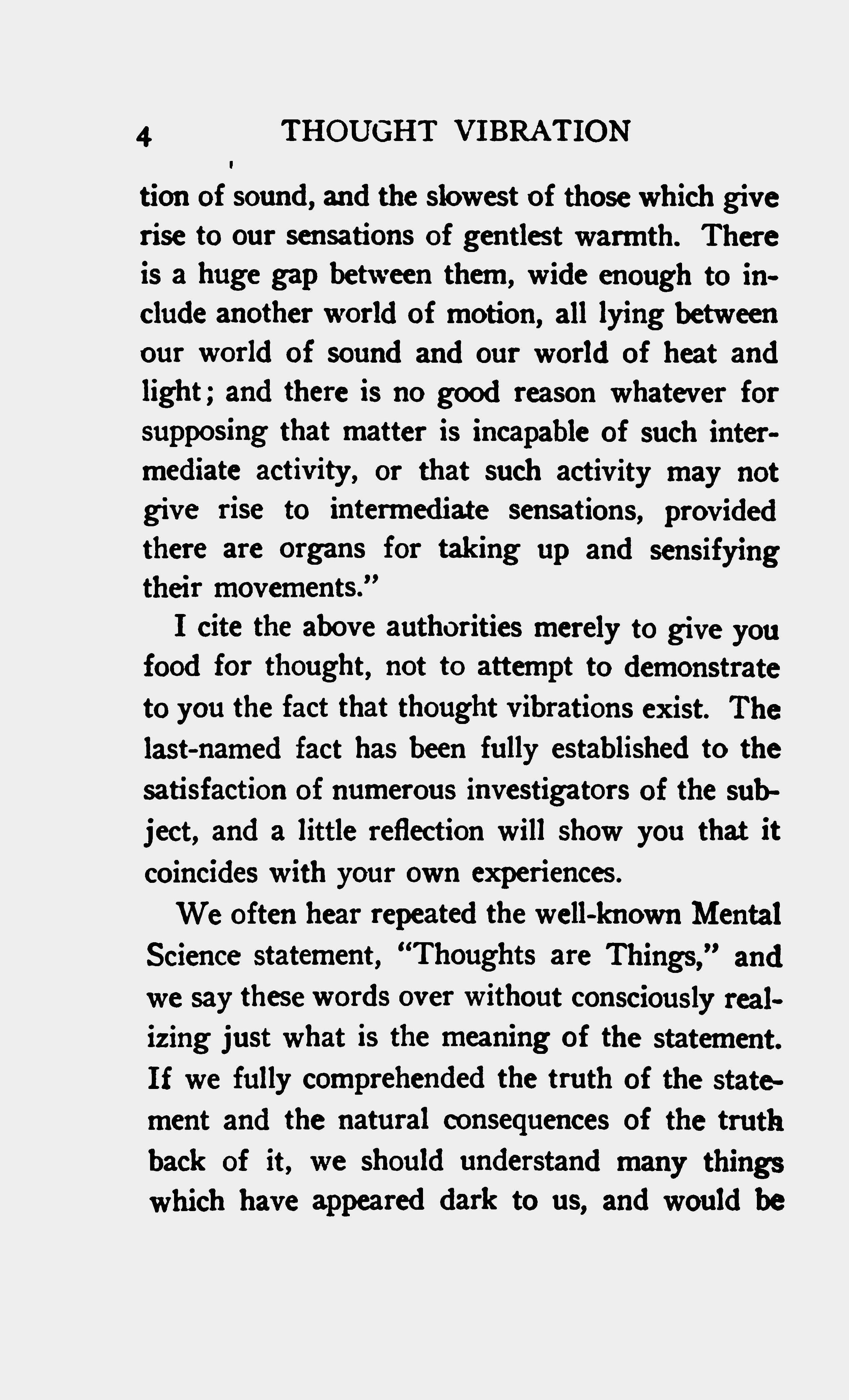 I cite the above authorities merely to give you food for thought, not to attempt to demonstrate to you the fact that thought vibrations exist. The last-named fact has been fully established to the satisfaction of numerous investigators of the subject, and a little reflection will show you that it coincides with your own experiences.